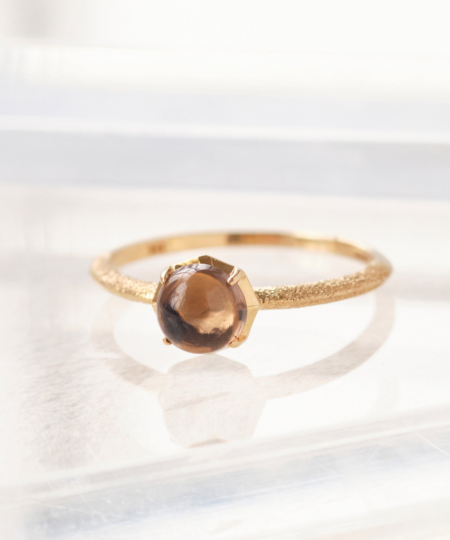 惑星をイメージしたカボションカットのスモーキークォーツが輝くリング。腕にスターダスト加工を施し、夜空をかける美しい天の川に見立てたデザイン。