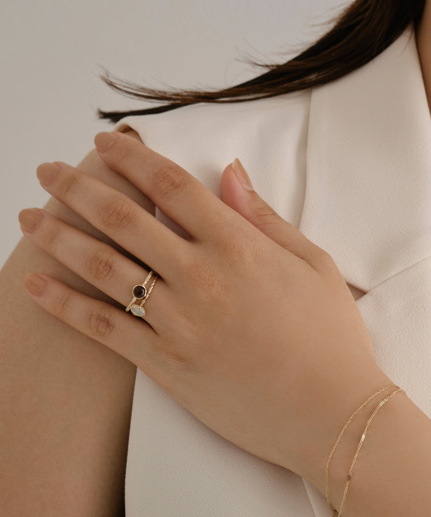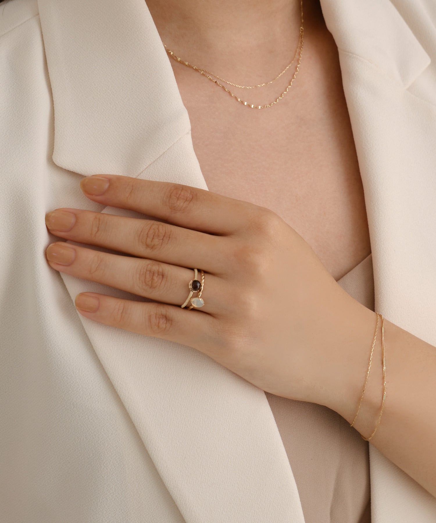 石枠は星が反射している様子を表現し、石の存在感を惹き立てます。天然石リングとの重ね着けもおすすめです。