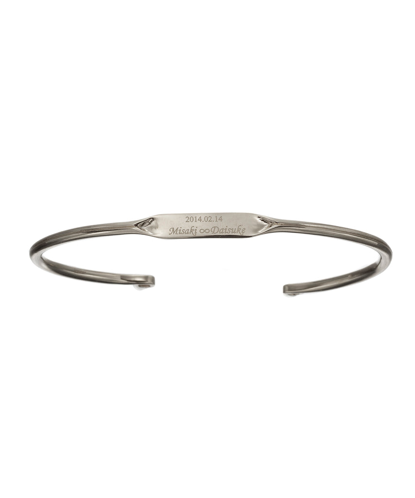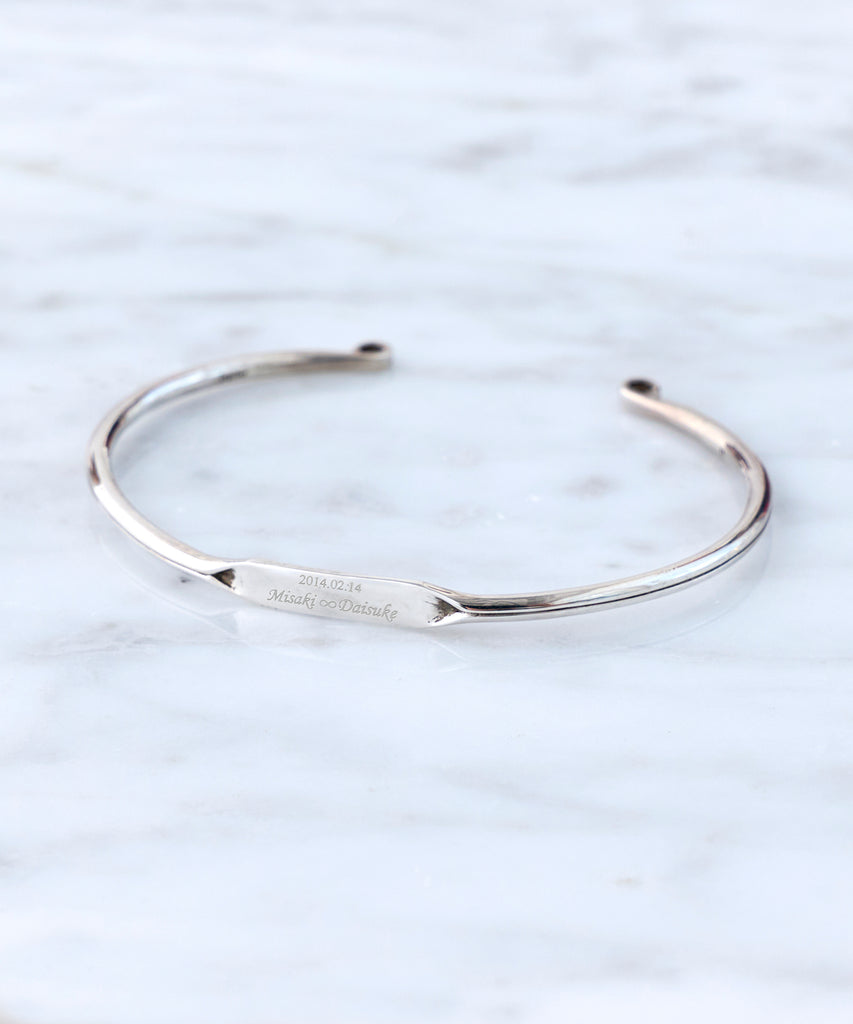 出産後にお子様とママの腕に着けられるIDタグをイメージし、2人を繋ぐ愛のリボンとしてデザインしたカフタイプのバングルです。プレートの部分には、人生の記念日や大切な人の名前など記録しておきたい文字を刻印していただけます。プレート部分の両サイドはリボンを折りたたんだようなデザインですっきりと仕上げました。ママが出産記念にお子様の名前を刻印して身に着け、記念日にそれを贈ることで受け継ぐジュエリーとしたり、カップルで着けていただくこともできます。お揃いでリング&ベビーリングの展開がございます。