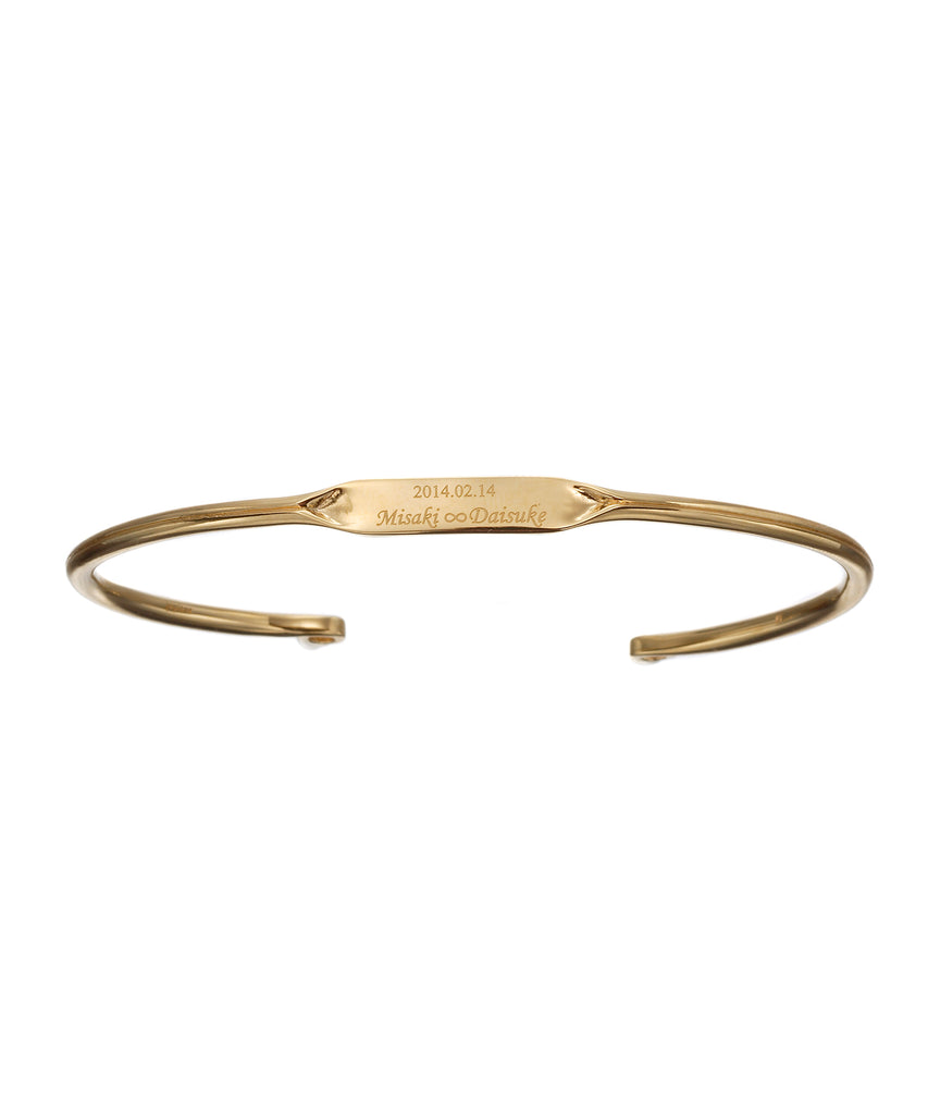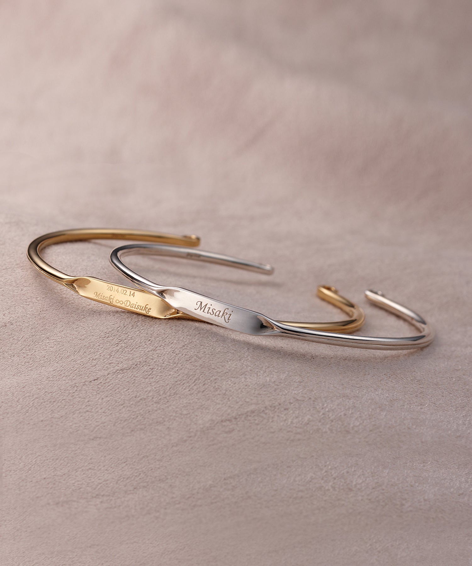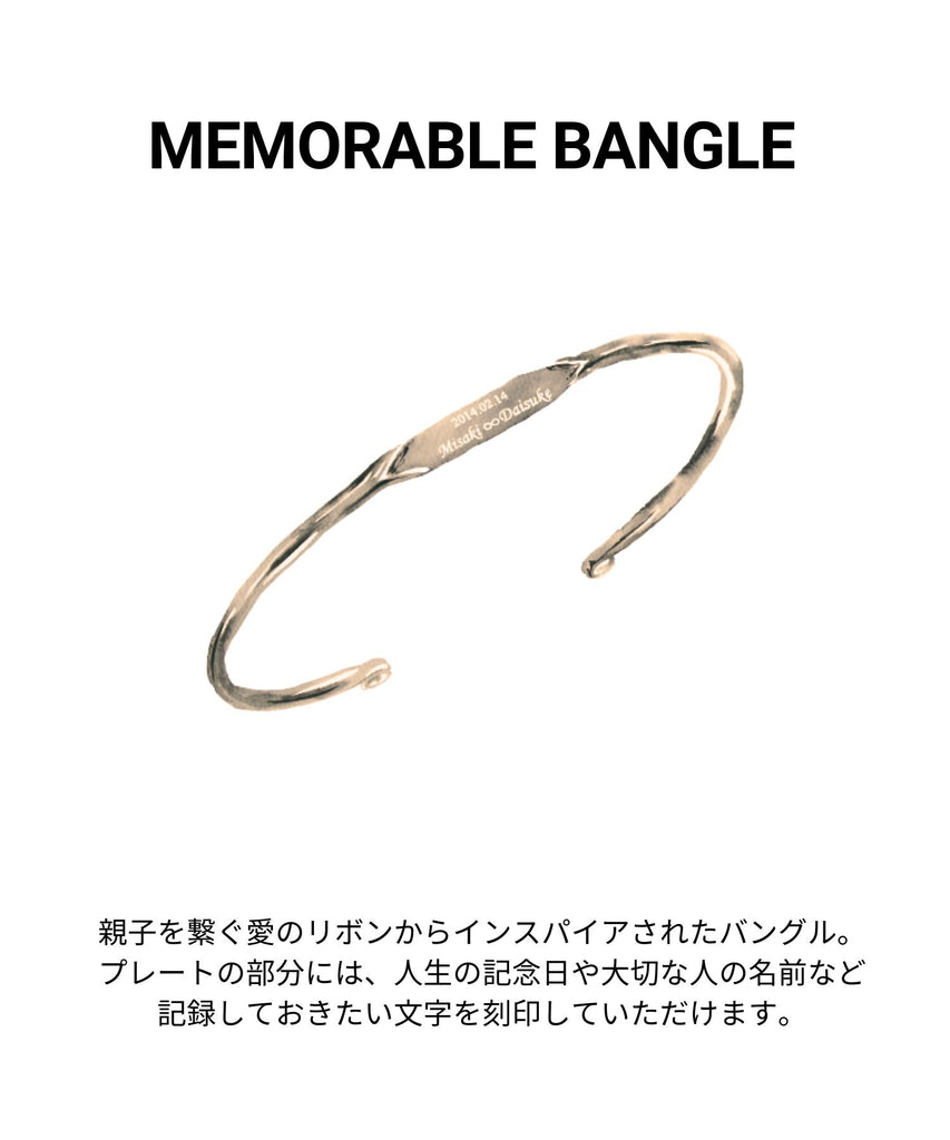 出産後にお子様とママの腕に着けられるIDタグをイメージし、2人を繋ぐ愛のリボンとしてデザインしたカフタイプのバングルです。プレートの部分には、人生の記念日や大切な人の名前など記録しておきたい文字を刻印していただけます。プレート部分の両サイドはリボンを折りたたんだようなデザインですっきりと仕上げました。ママが出産記念にお子様の名前を刻印して身に着け、記念日にそれを贈ることで受け継ぐジュエリーとしたり、カップルで着けていただくこともできます。お揃いでリング&ベビーリングの展開がございます。
