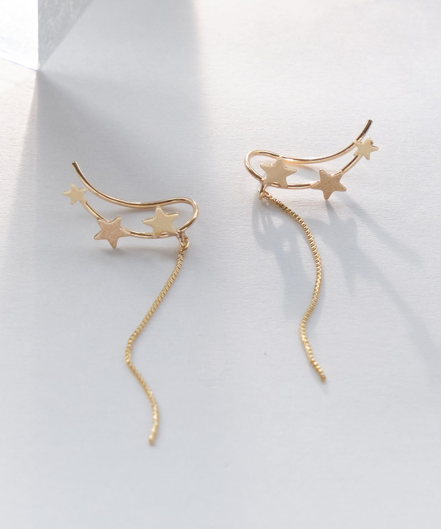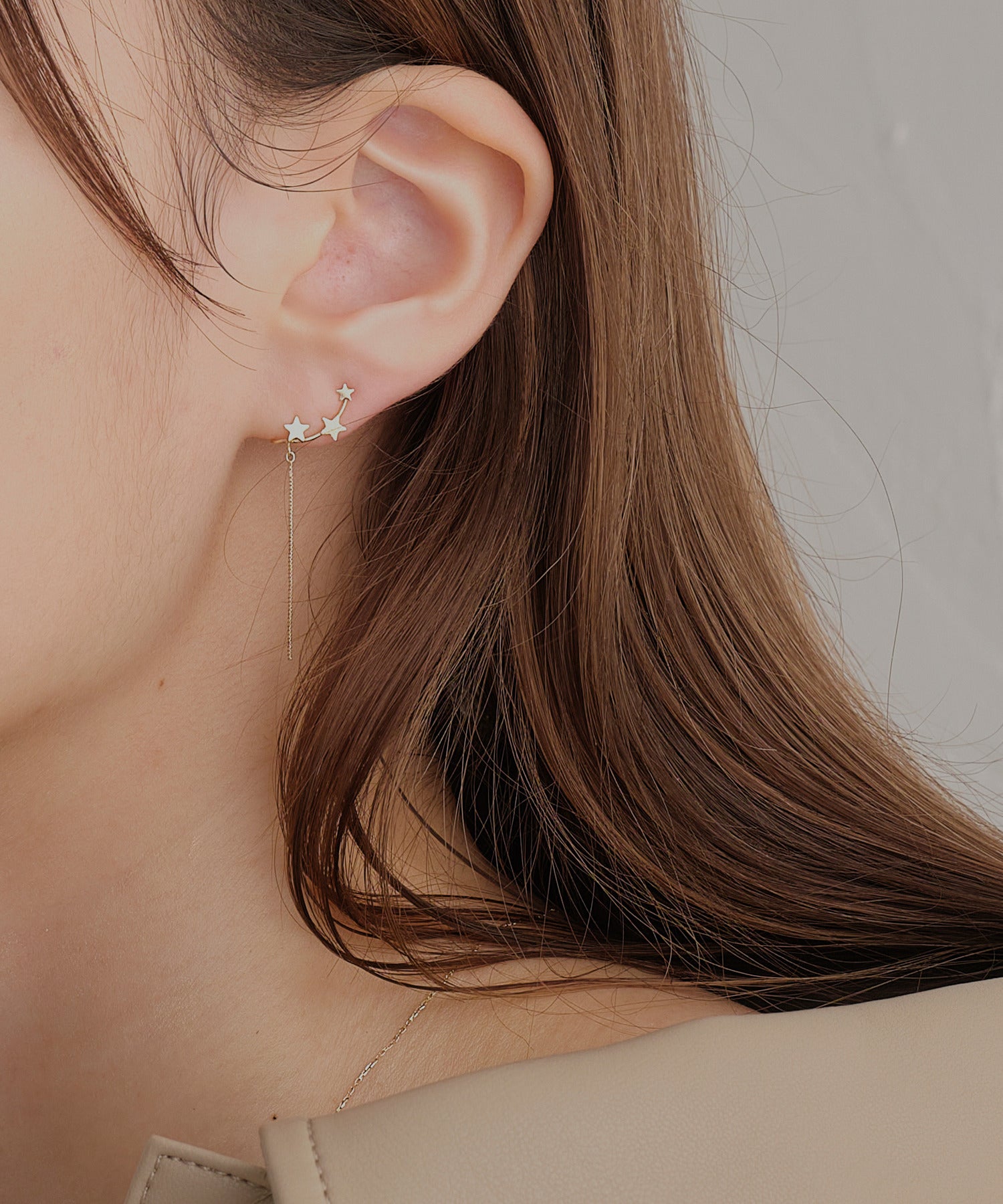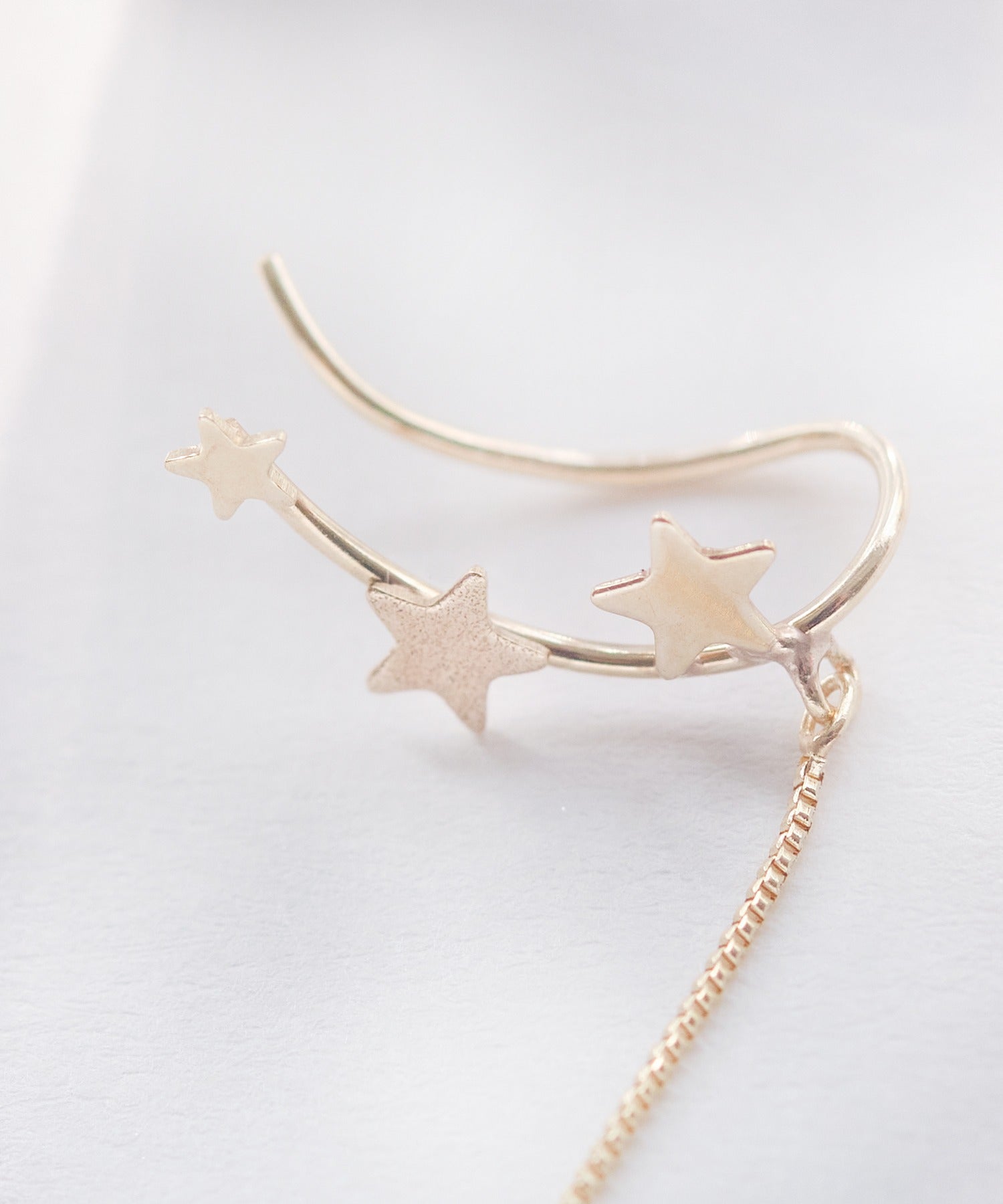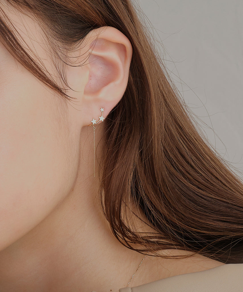 鏡面加工とマット加工を施した大小3つの星が「銀河」を、繊細な輝きを放つチェーンは「ほうき星」を表現しています。身に着けた人に幸運をもたらすと言われる星モチーフ。大人の装いに遊び心をプラスしてくれるデザインです。