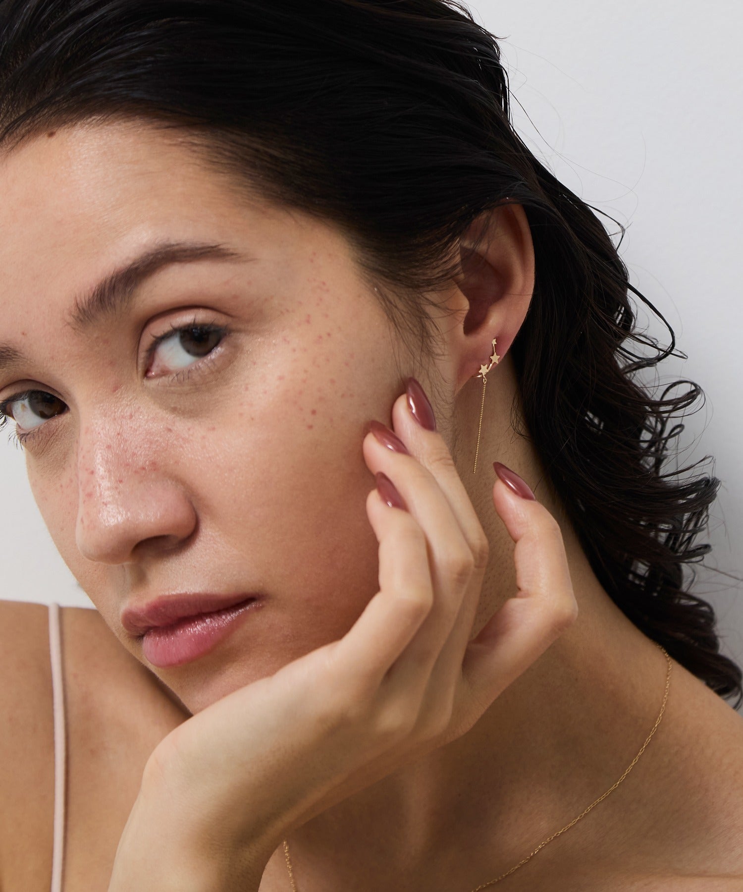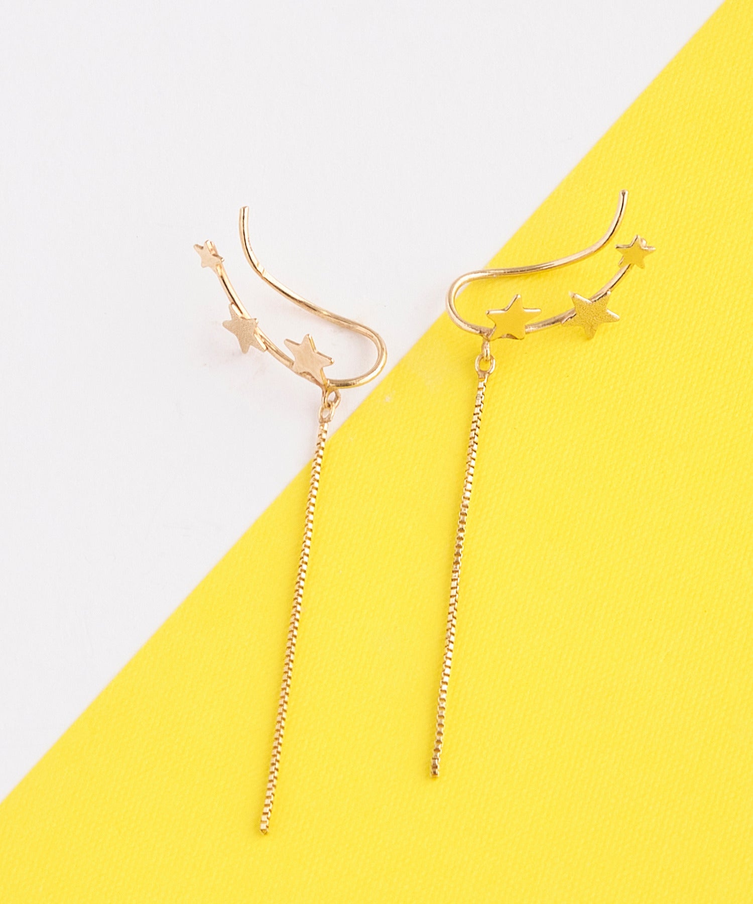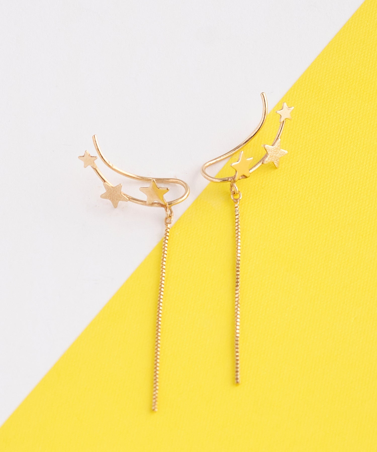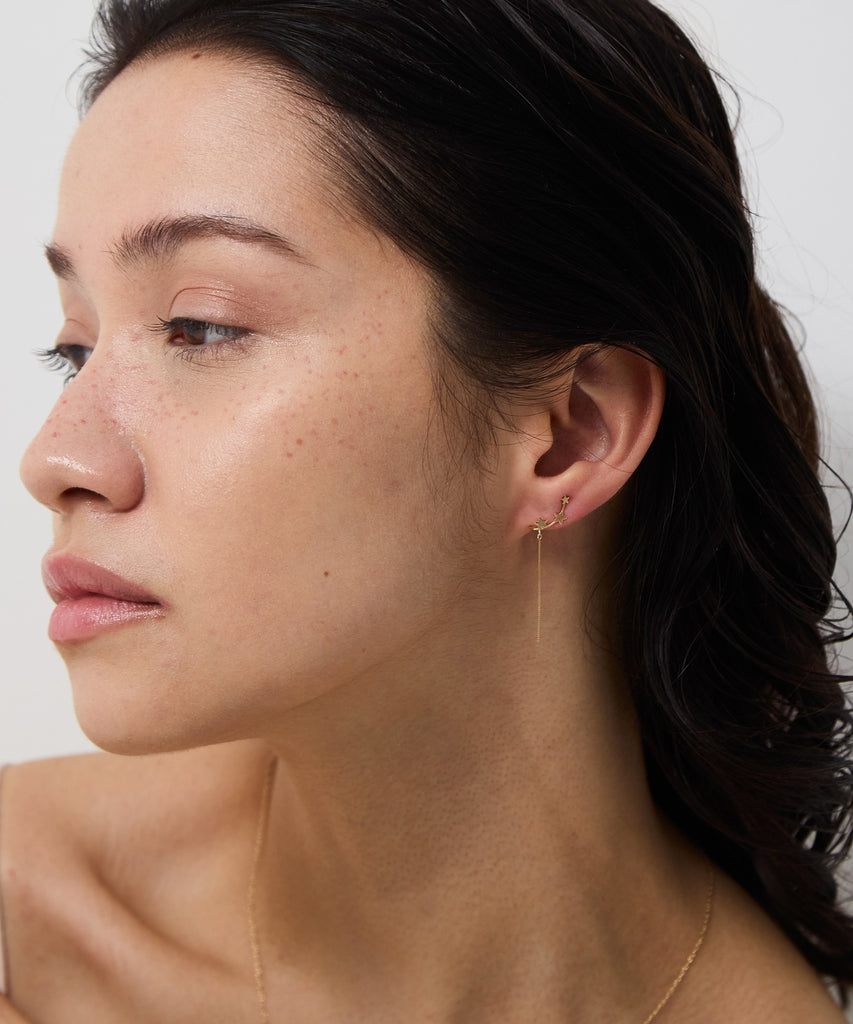 鏡面加工とマット加工を施した大小3つの星が「銀河」を、繊細な輝きを放つチェーンは「ほうき星」を表現しています。身に着けた人に幸運をもたらすと言われる星モチーフ。大人の装いに遊び心をプラスしてくれるデザインです。