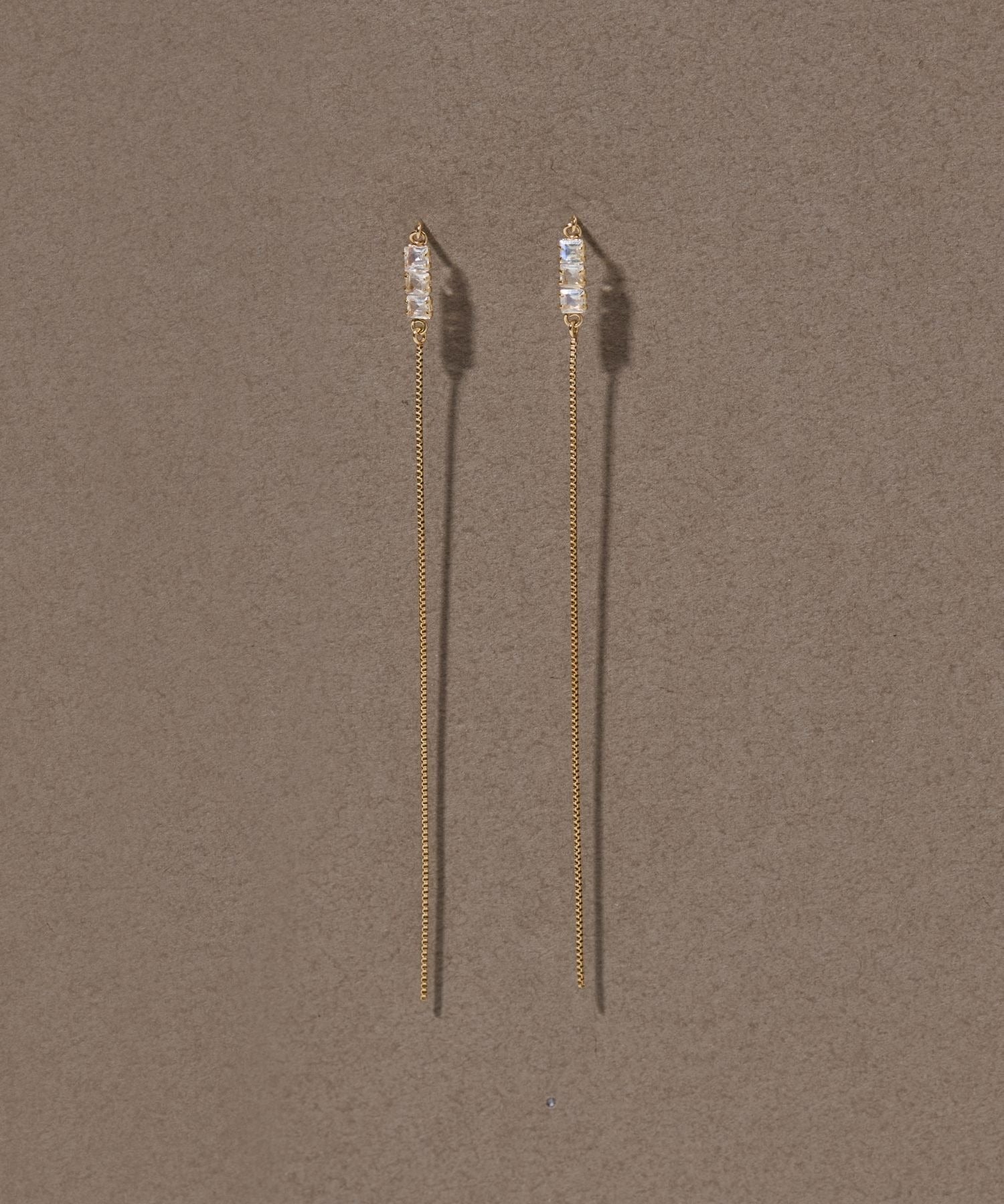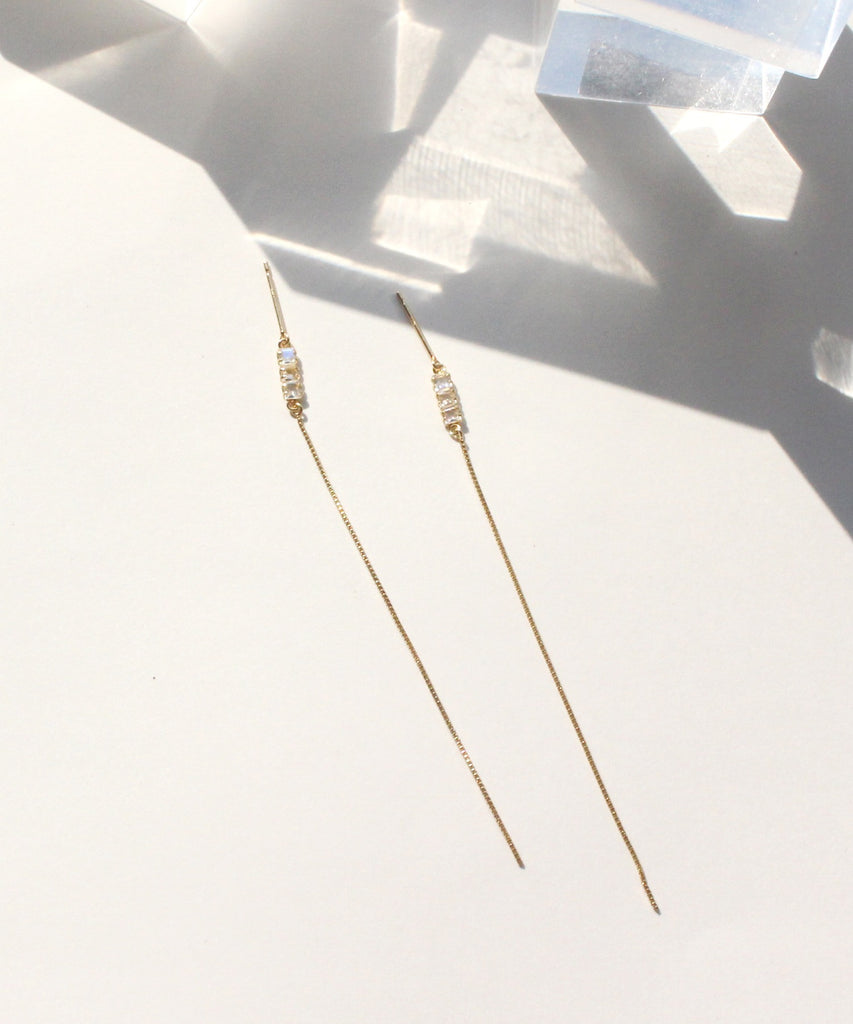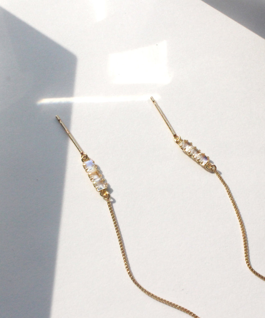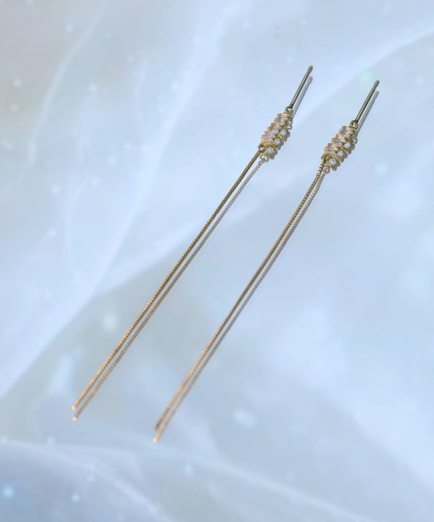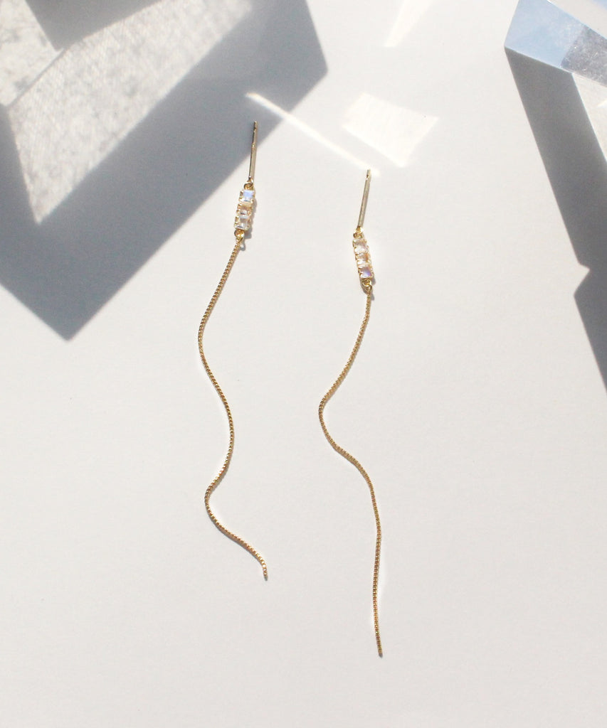 角砂糖のようなスクエアカットの天然石が、透明感のある表情を演出します。天然石はラブラドライトとホワイトトパーズを使用しました。揺れるチェーンが光を繊細に反射して縦のラインを作り出す、すっきりとしたデザインです。