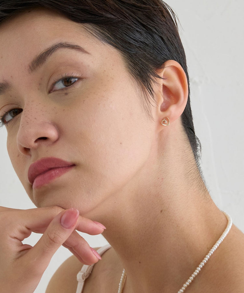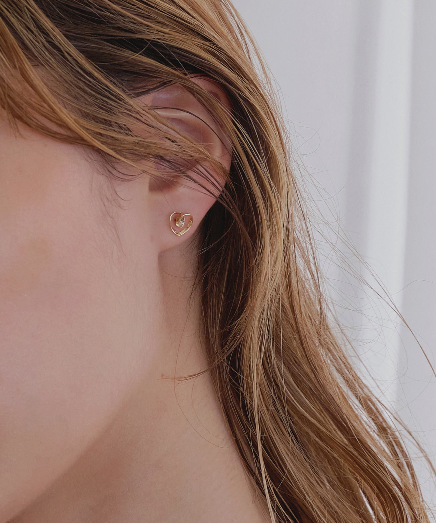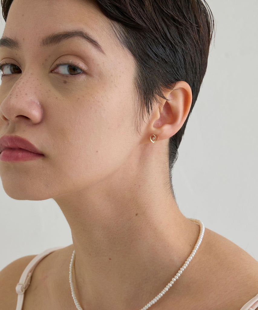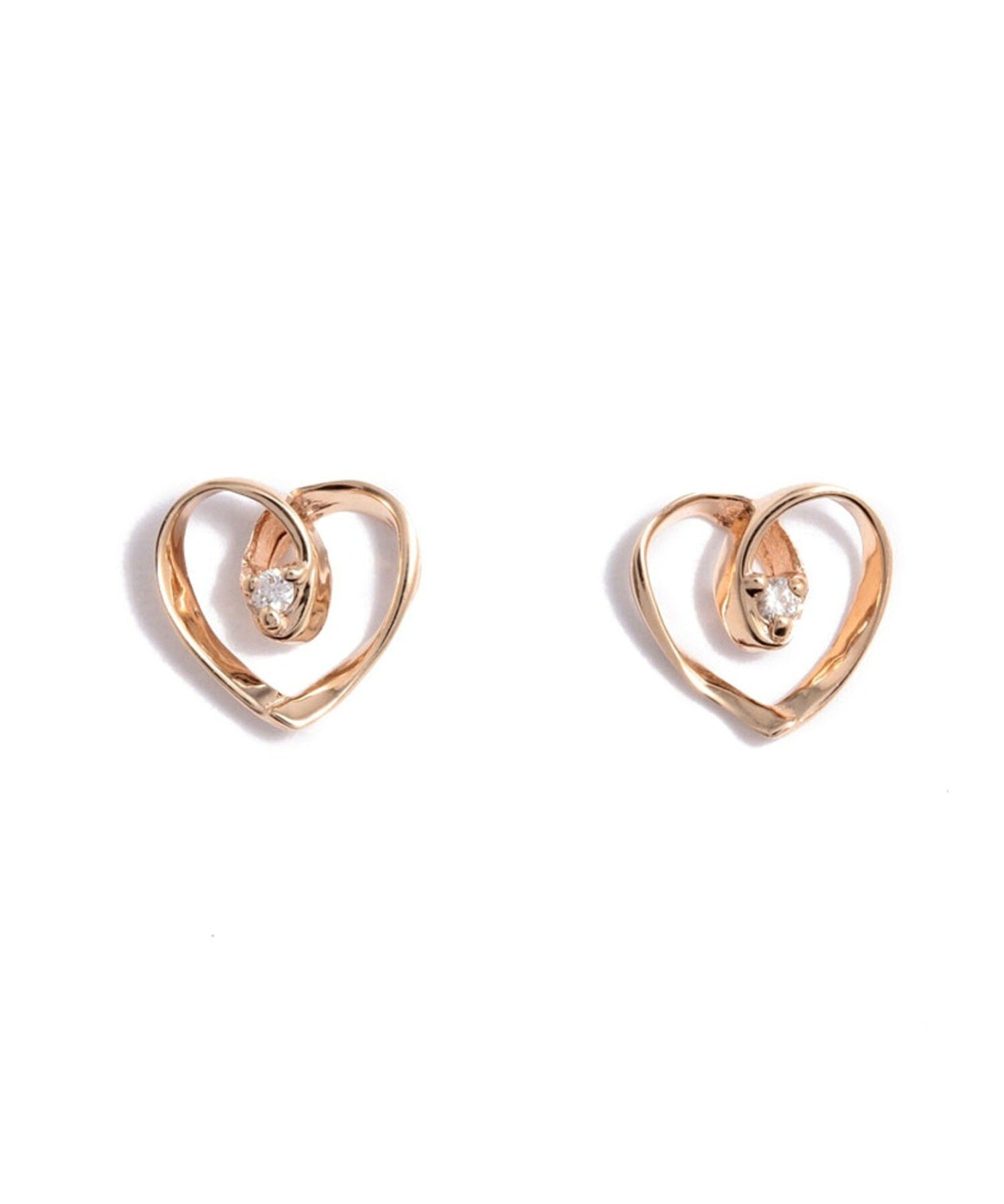 リボンが描くハートで包まれたようにセットされた1石のダイヤモンドが上品に輝き、耳元を女性らしく際立たせるベーシックアイテムです。