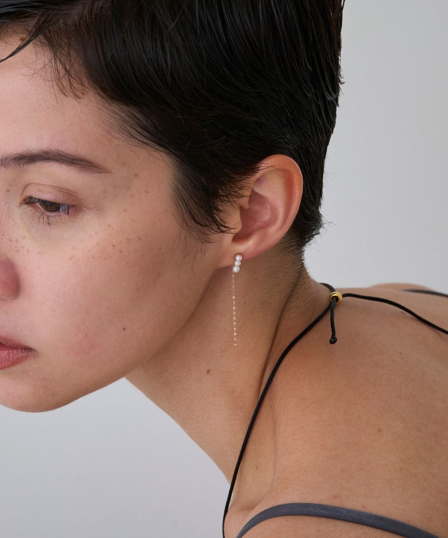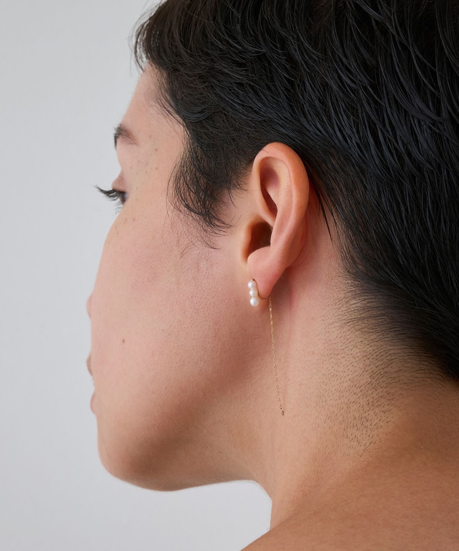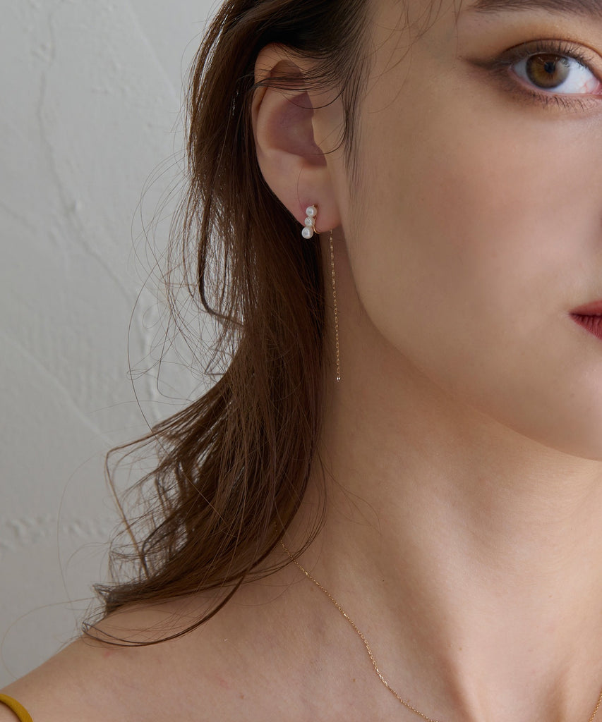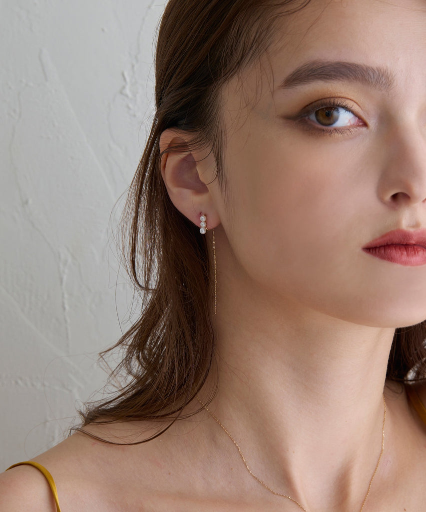 耳たぶの後ろからキラキラと輝くチェーンが揺れて、ピアスキャッチチャームのように見えるので、ピアス風の着けこなしを楽しめます。