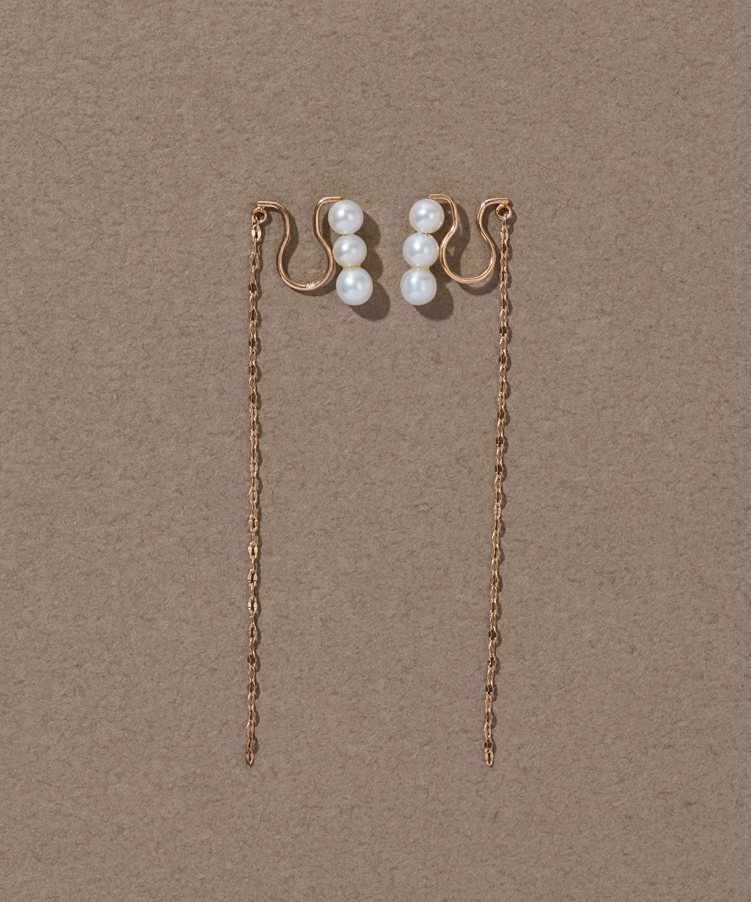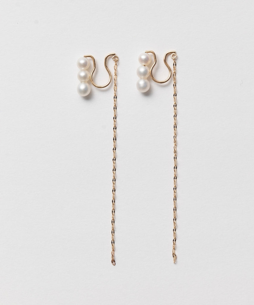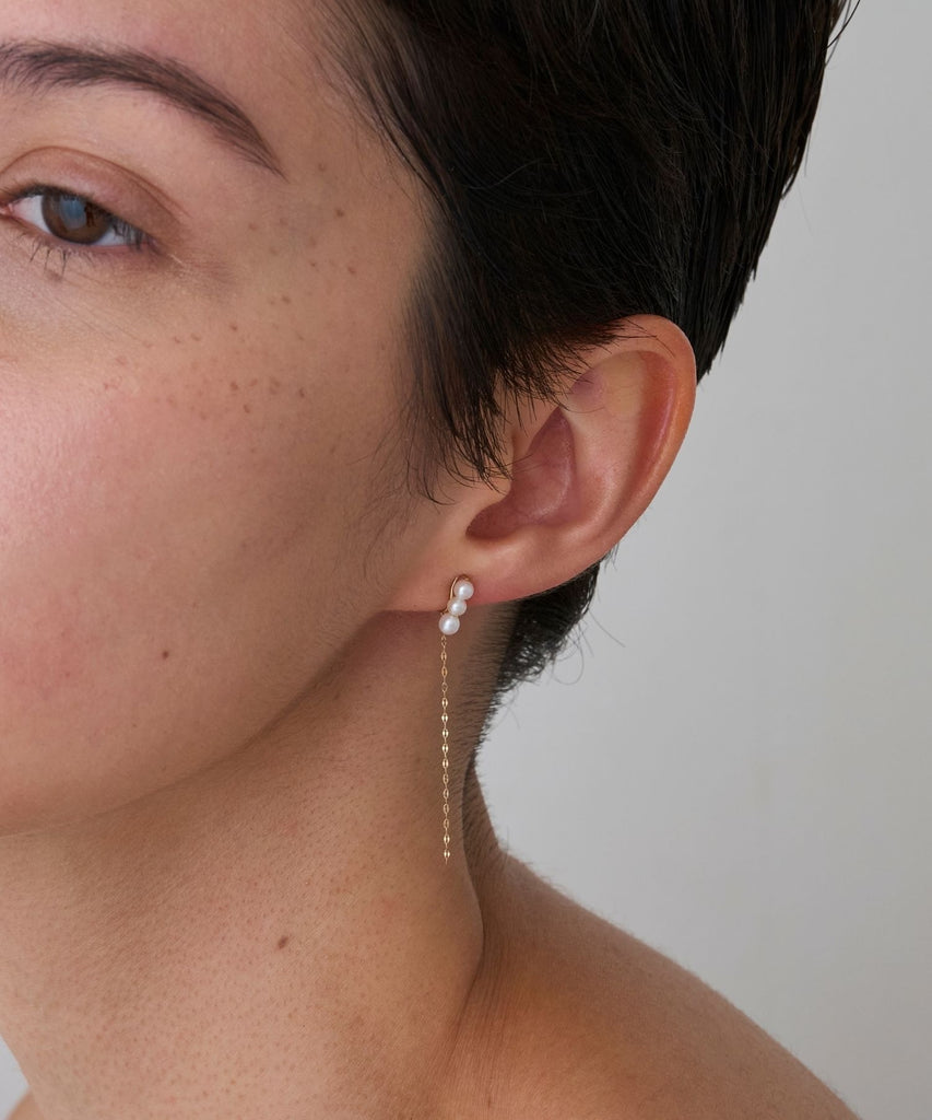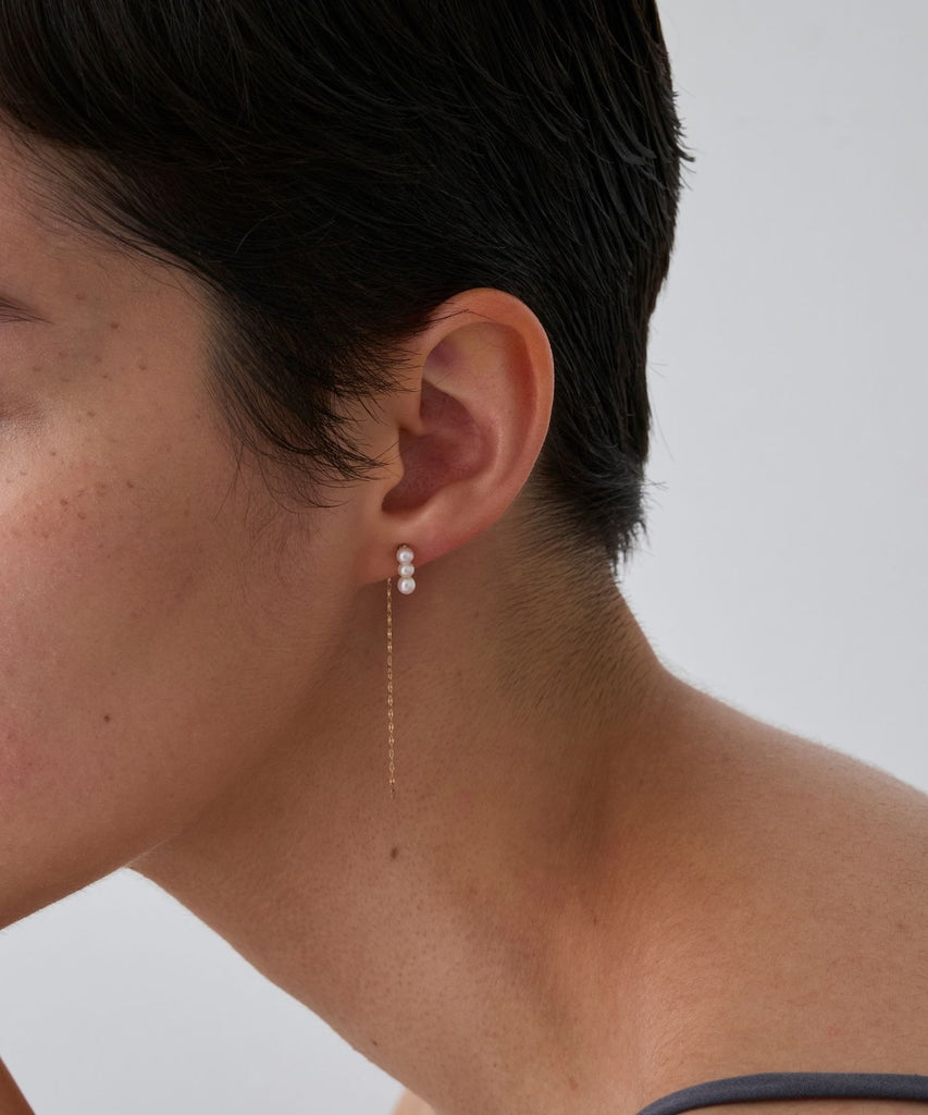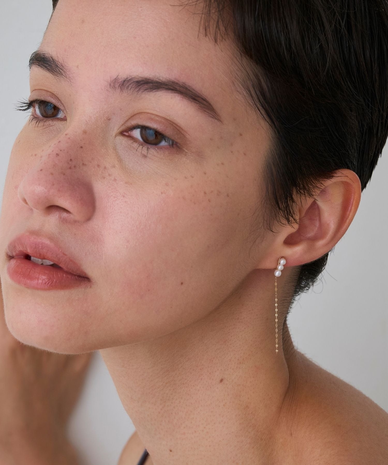 耳たぶの後ろからキラキラと輝くチェーンが揺れて、ピアスキャッチチャームのように見えるので、ピアス風の着けこなしを楽しめます。