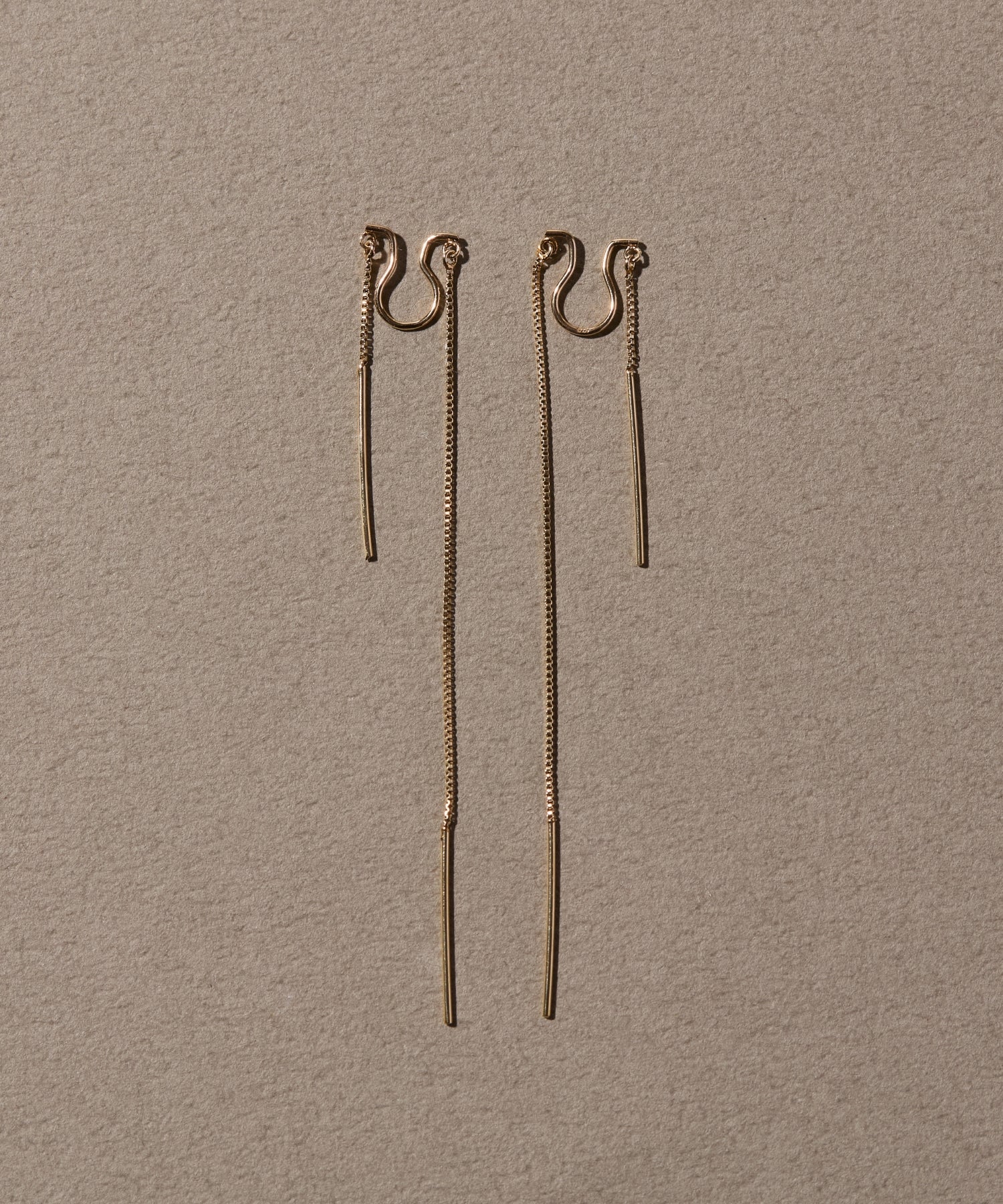 小さなボックスの連なりで出来たベネチアンチェーンを使用し、アメリカンピアスを着けているように見えるイヤリング。