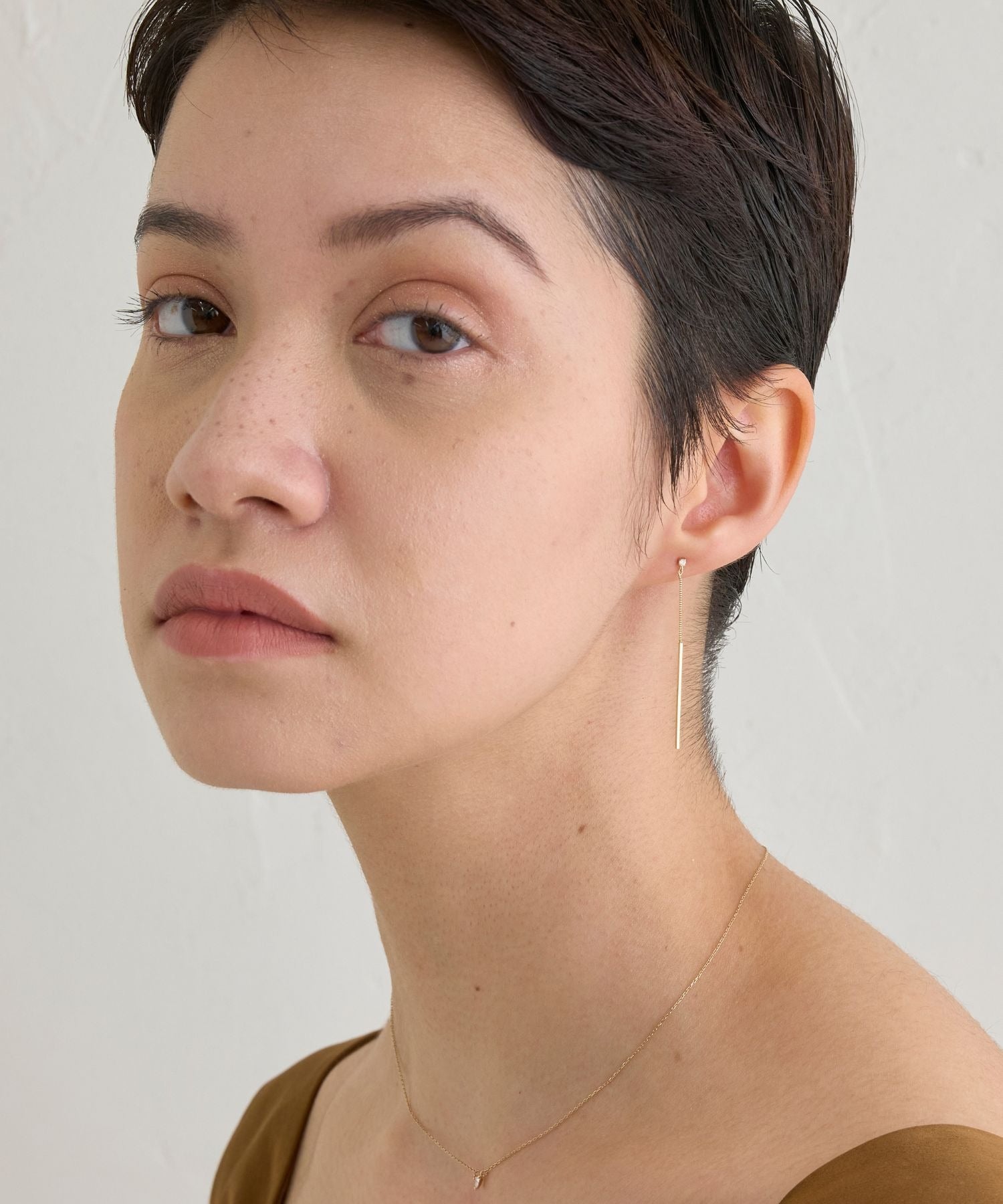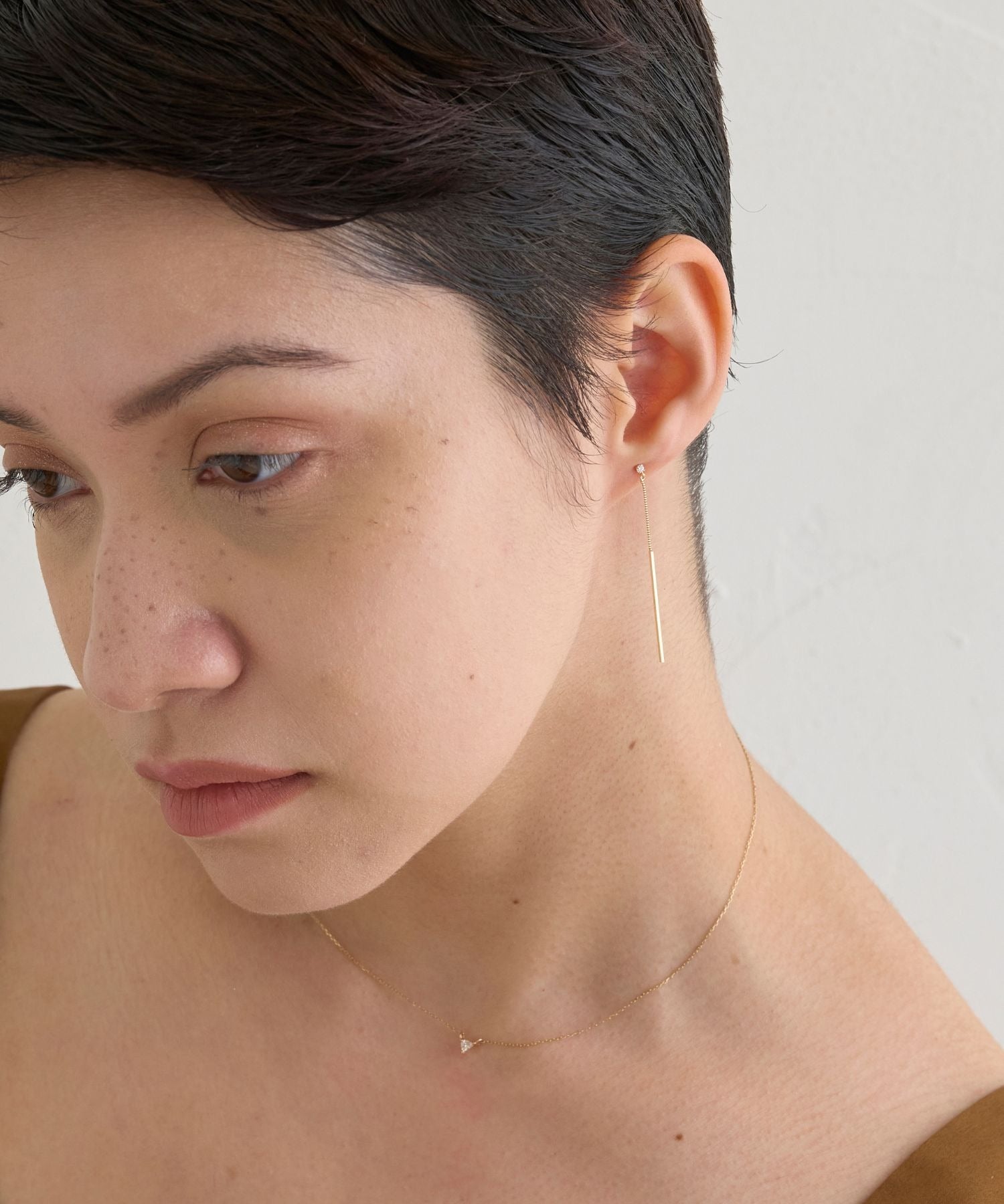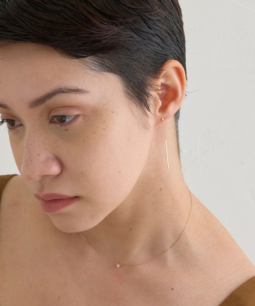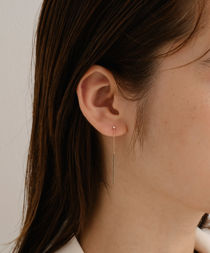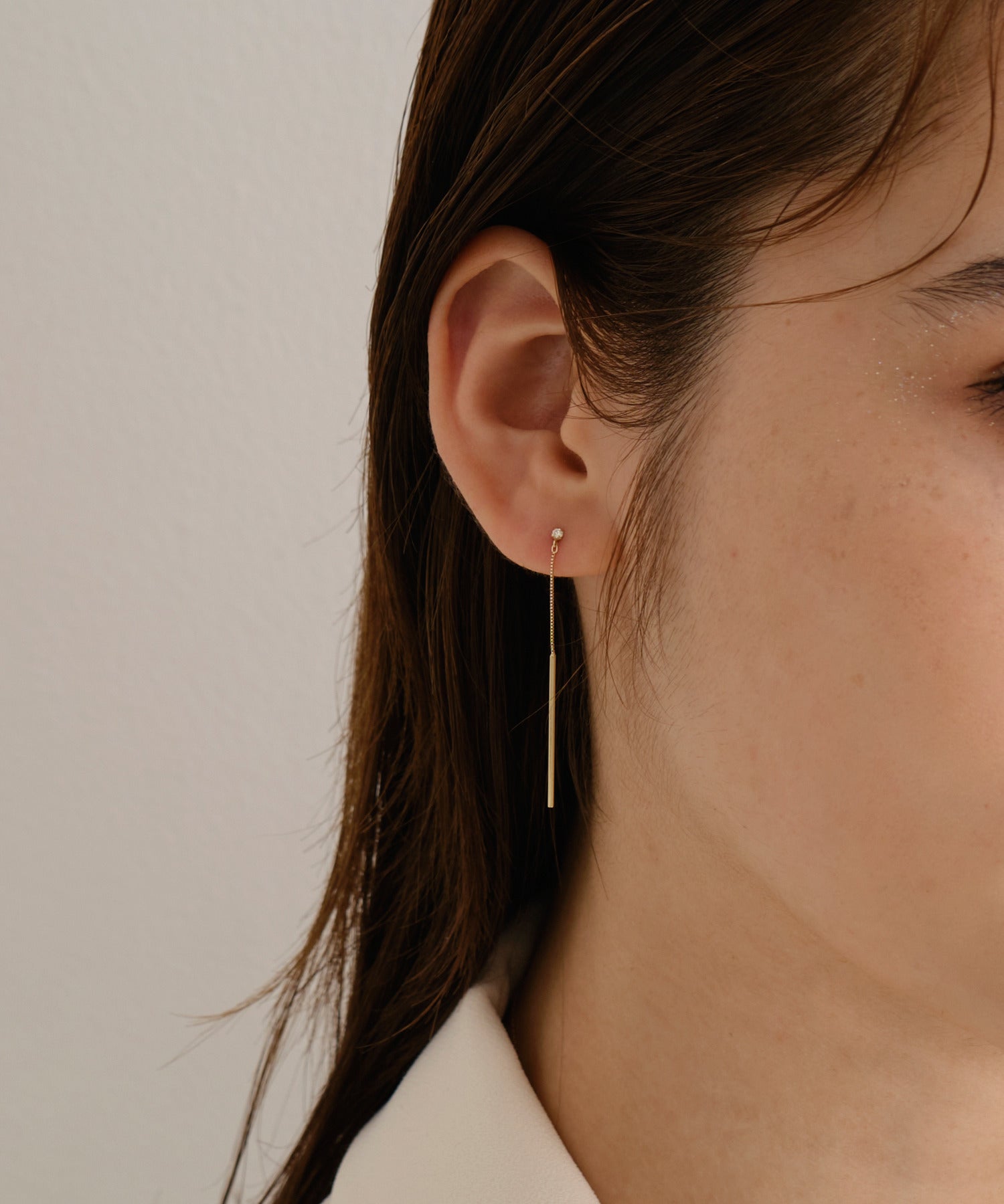 バーチャームが、揺れるたびにキラキラと光を反射して視線を集めるピアス。1粒ダイヤモンドが上品シンプルなデザインは、シーンを選ばない使いやすいアイテムです。