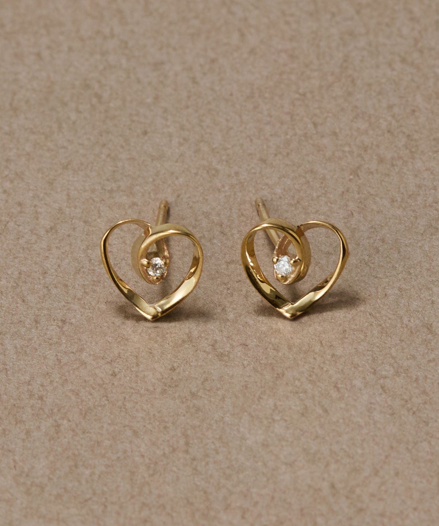 リボンが描くハートで包まれたようにセットされた1石のダイヤモンドが上品に輝き、耳元を女性らしく際立たせるベーシックアイテムです。