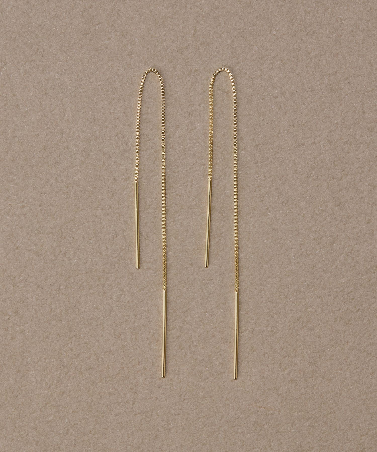 小さなボックスの連なりで出来たベネチアンチェーンを使用しました。チェーンの表面が光を反射して、落ち着きのある輝きを放ちます。揺れるラインが視線を集め、日々の装いにしっくりと馴染むベーシックデザインです。