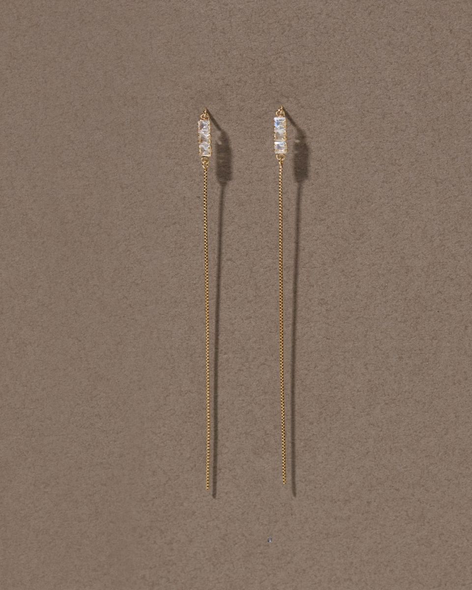 角砂糖のようなスクエアカットの天然石が、透明感のある表情を演出します。天然石はラブラドライトとホワイトトパーズを使用しました。揺れるチェーンが光を繊細に反射して縦のラインを作り出す、すっきりとしたデザインです。
