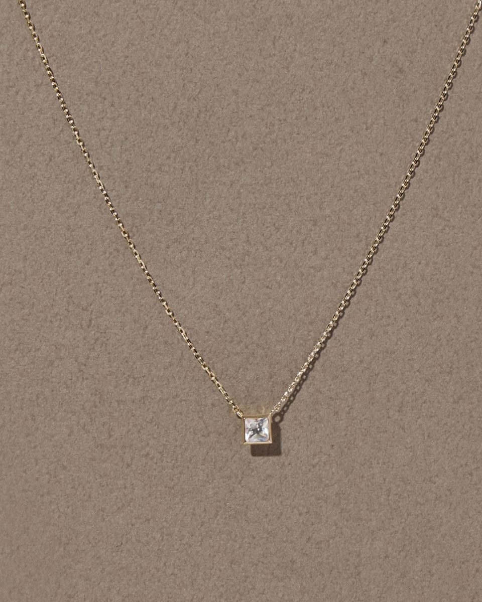 スクエアカットのレインボームーンストーンは、時に虹色に光り輝き、不思議な色を放ちます。肌に馴染むような柔らかな光の表情は思わず視線を集めるネックレス。