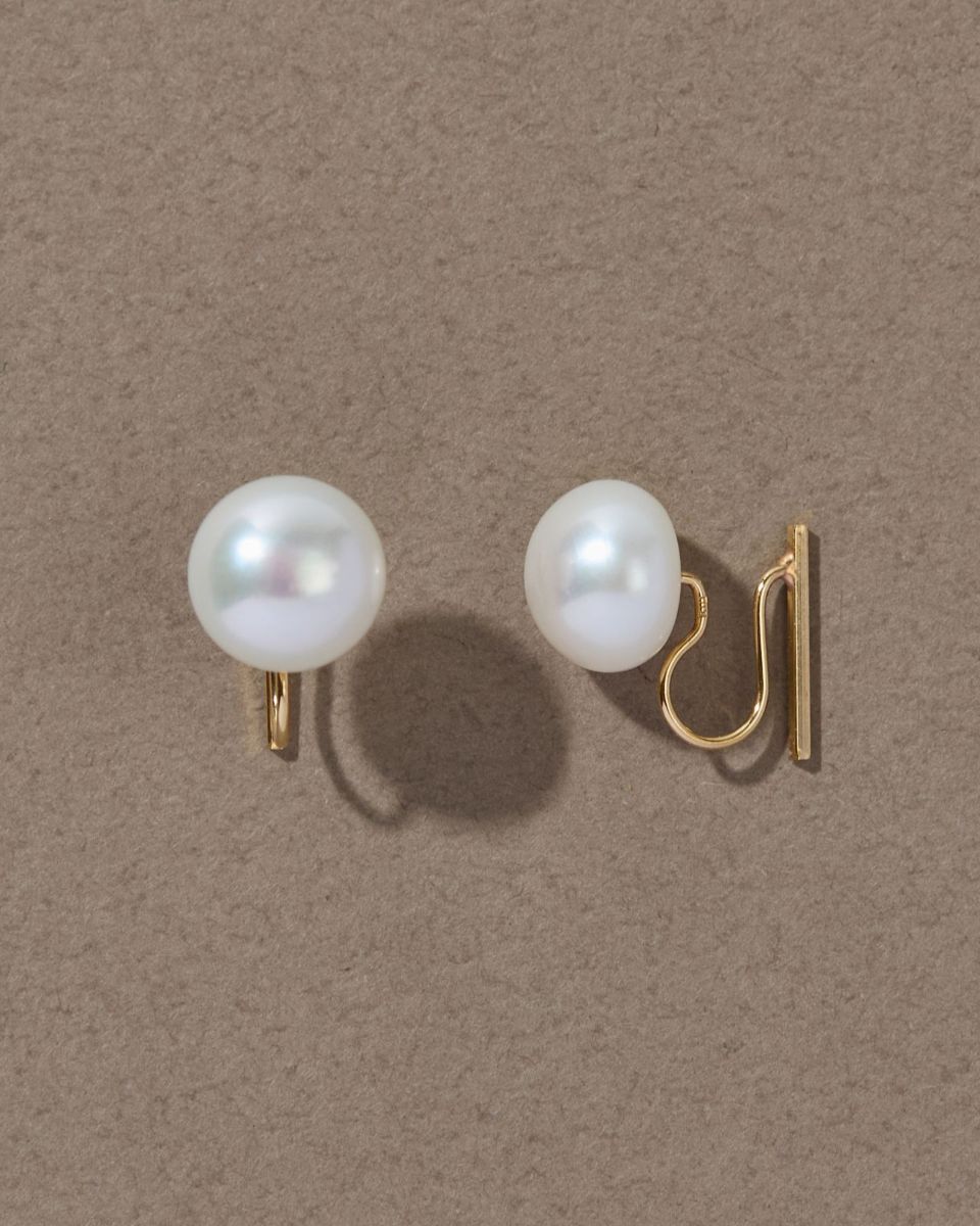 痛くなりにくいクリップ式イヤリングで耳たぶに挟むだけの簡単な着け方で、金具を目立たせずにイヤリングを楽しめます。大粒パールとバーモチーフでクリップ金具が隠れて、ピアスを着けているように見えます。