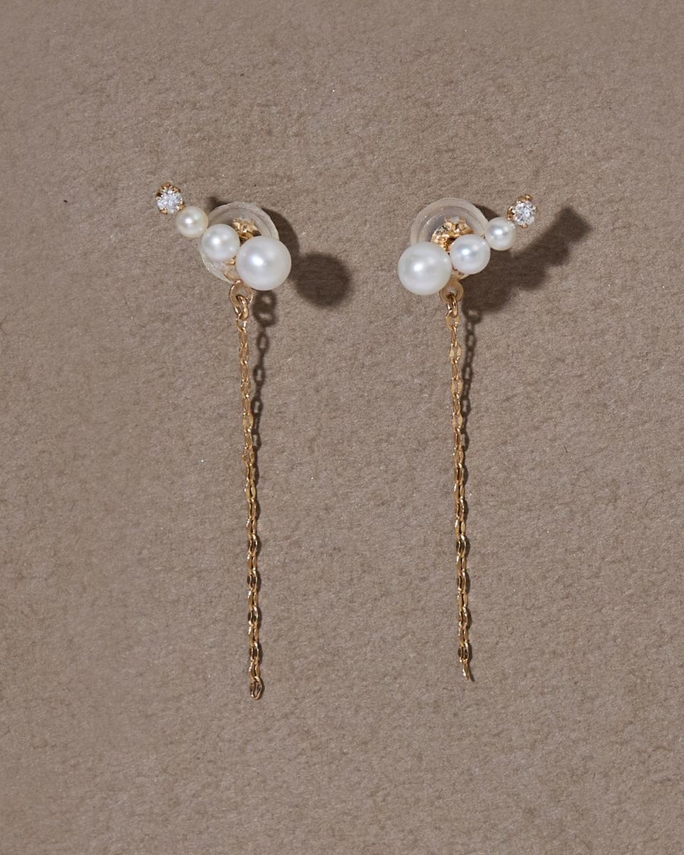 耳たぶの後ろからキラキラと輝くチェーンが揺れて顔周りを華やかにしてくれます。