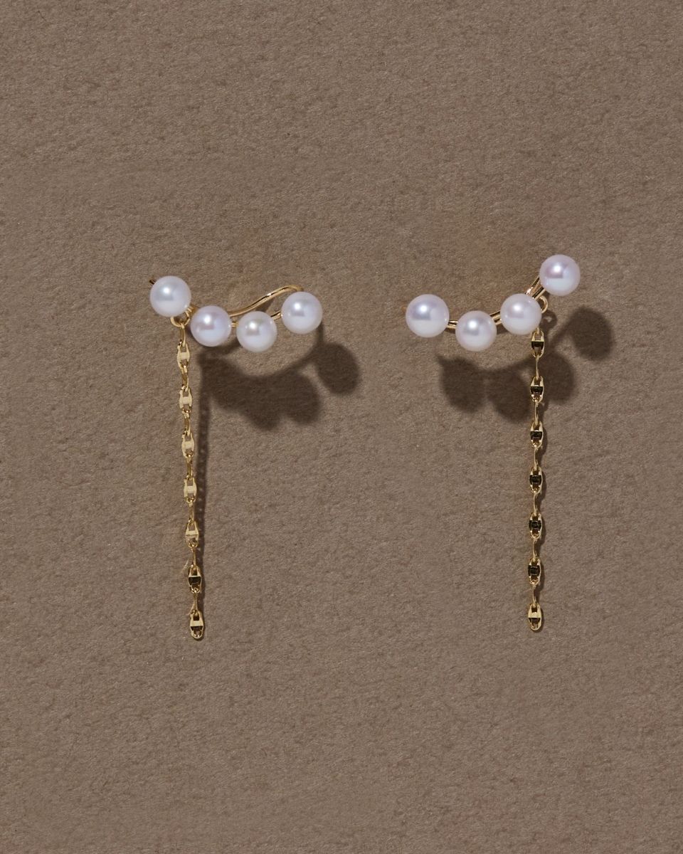 耳たぶの後ろから繊細に輝くチェーンが揺れて、ピアスキャッチチャームのように見えるので、ピアス風の着けこなしを楽しめます。