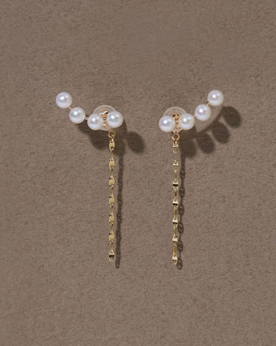 耳たぶの後ろからキラキラと輝くチェーンが揺れて顔周りを華やかにしてくれます。