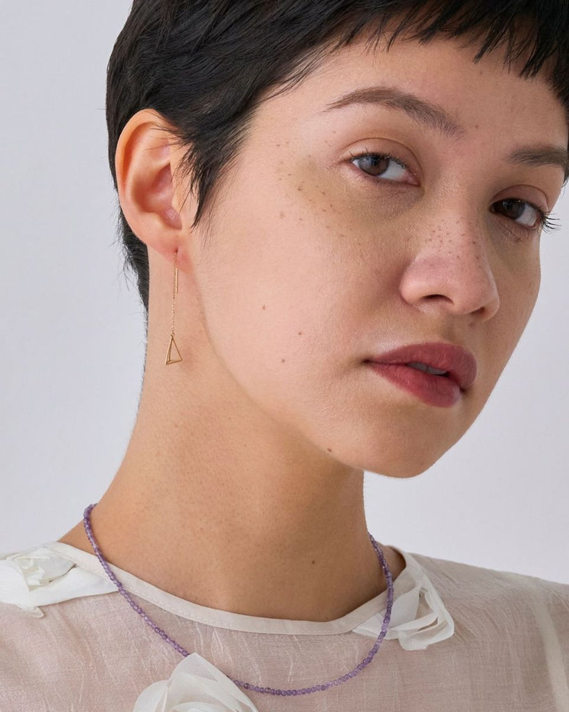 お好みの長さで楽しめるアメリカンピアスの先端に、トレンドの幾何学モチーフをあしらいました。