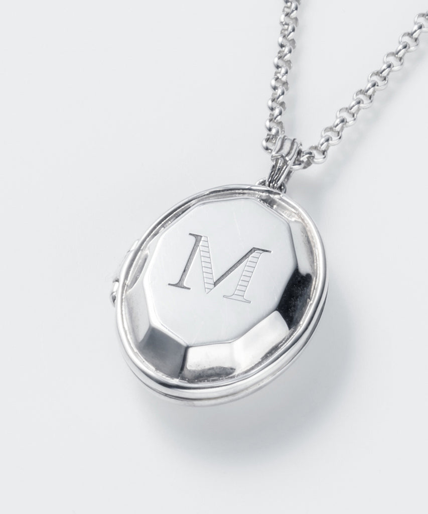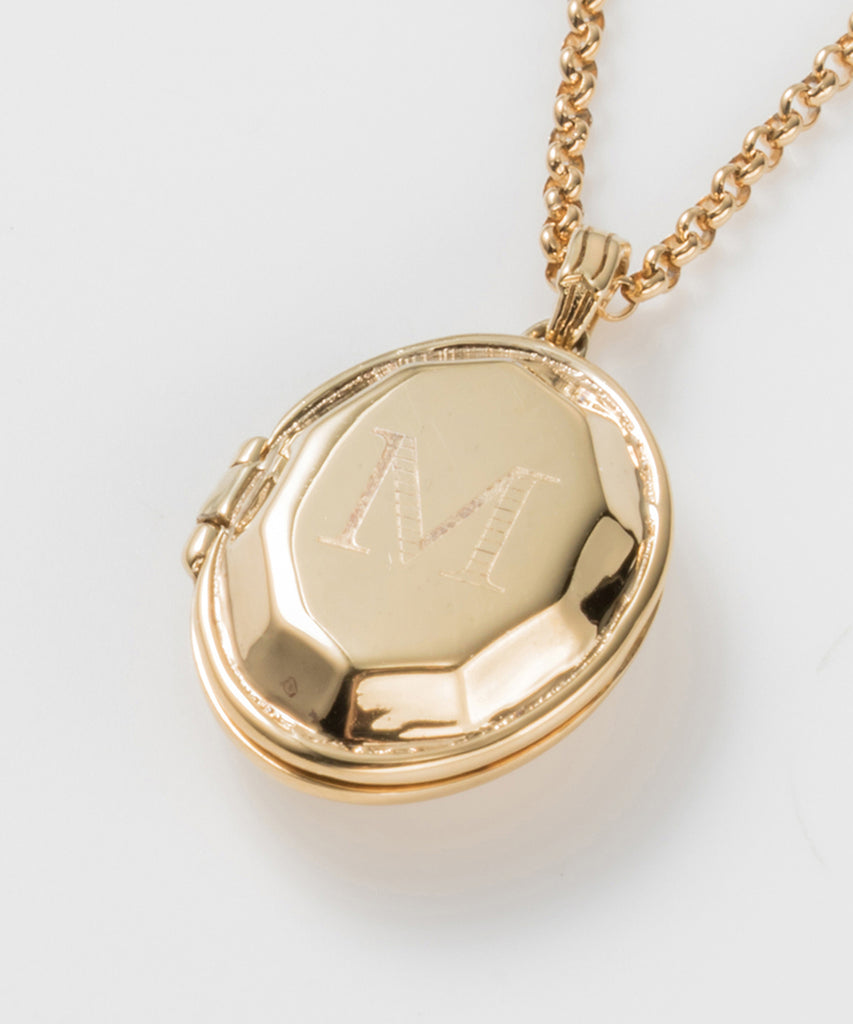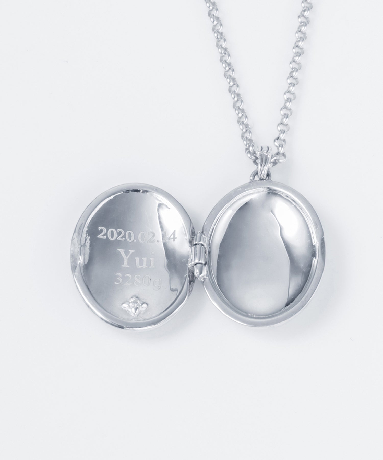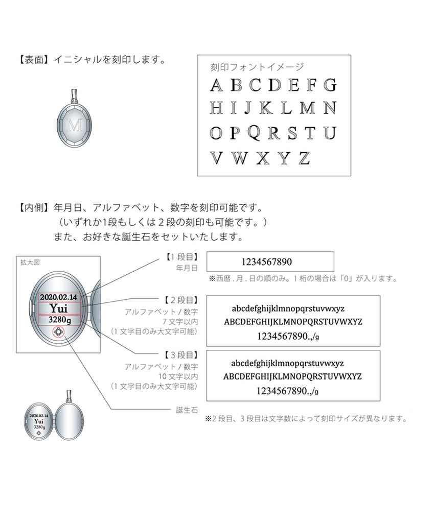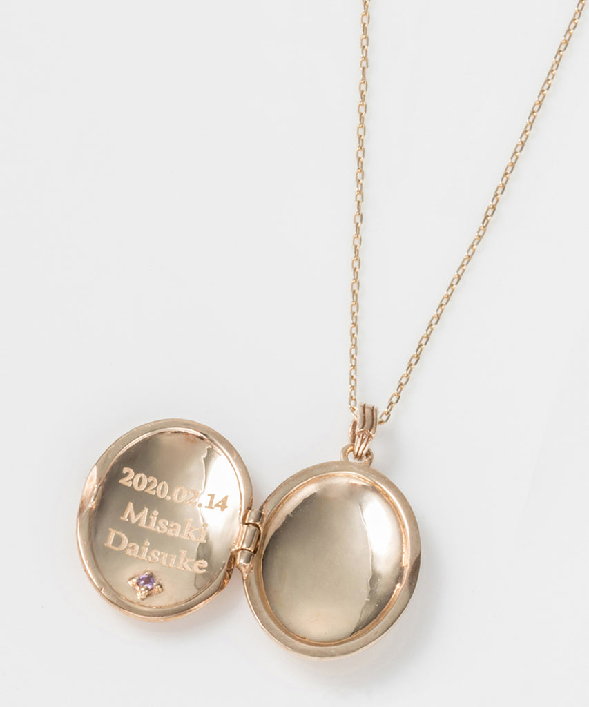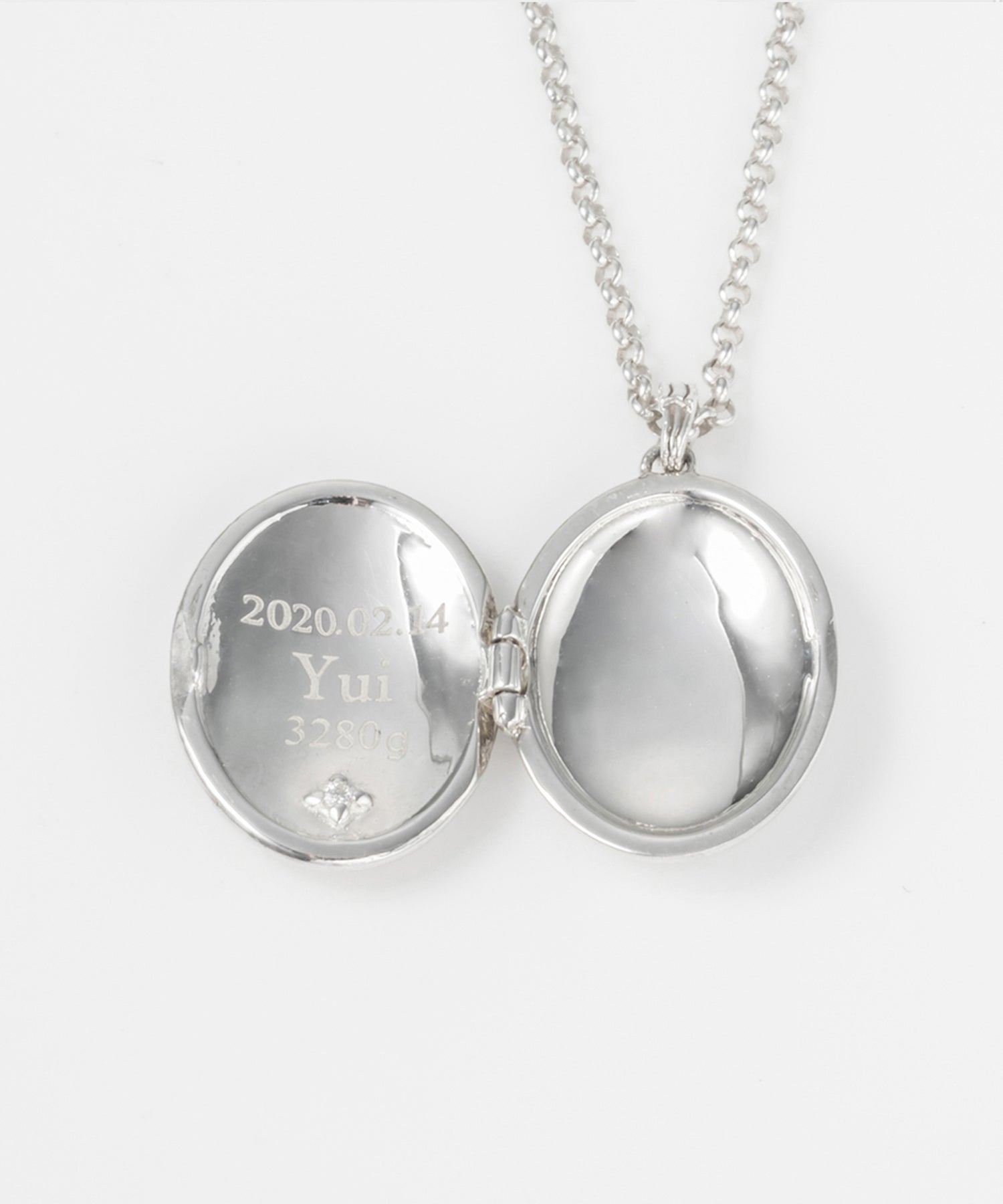 ロケットネックレスの表にイニシャルと、内側にお名前や日付を刻印できます。