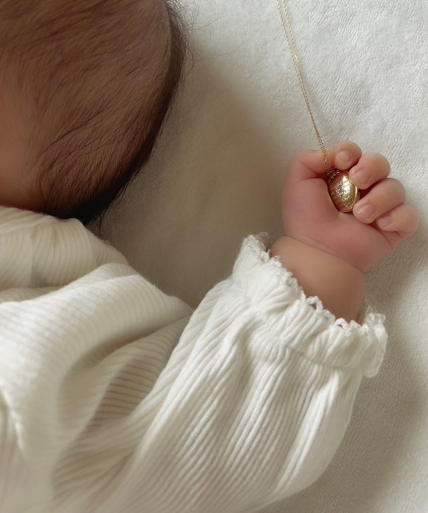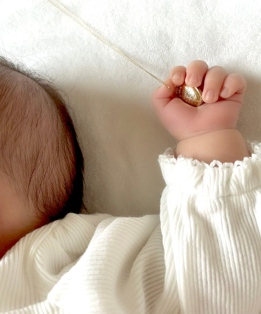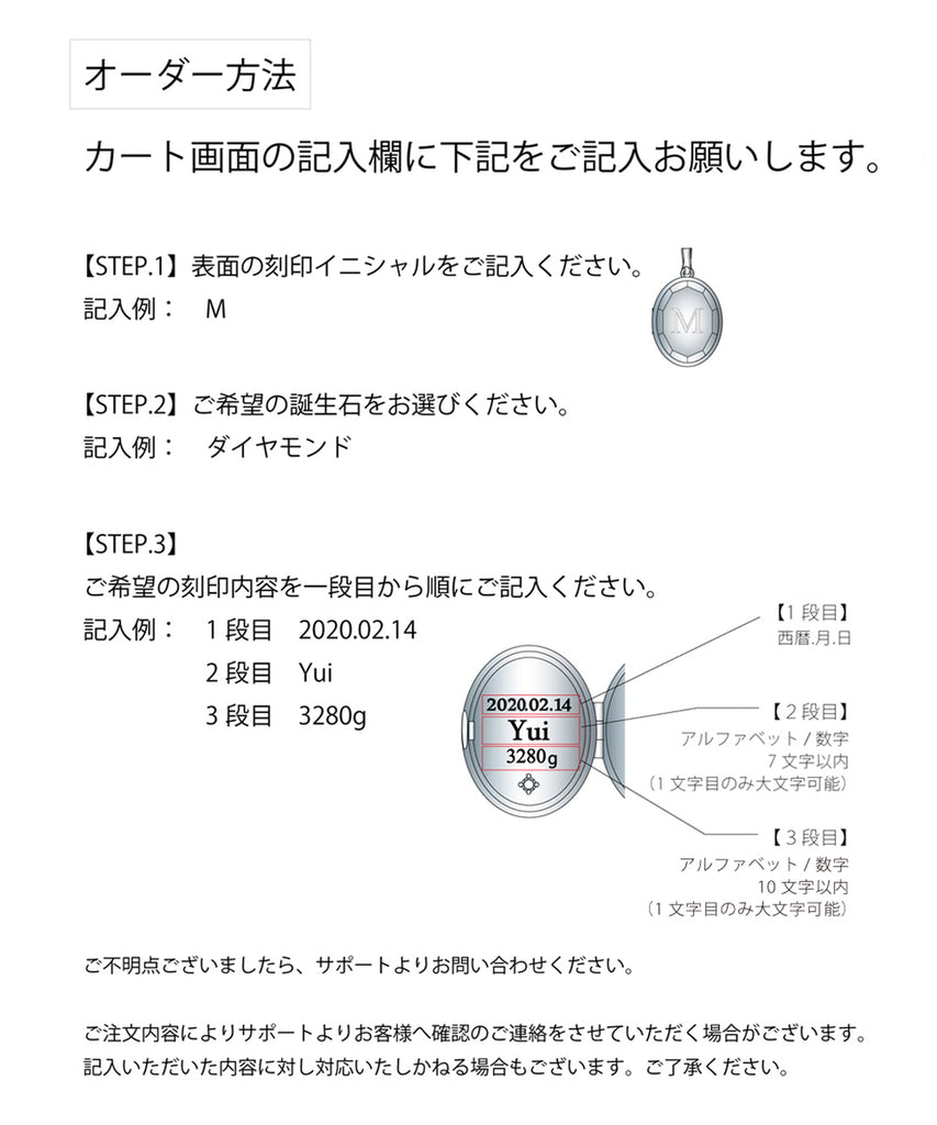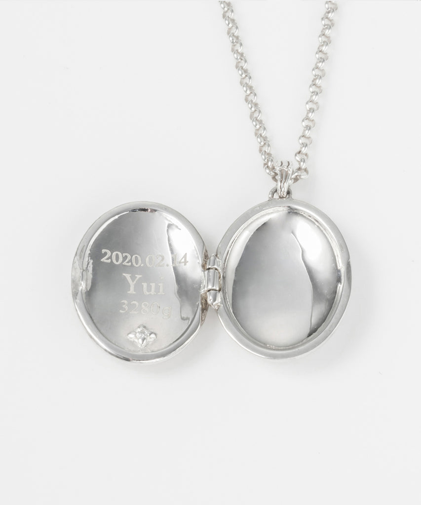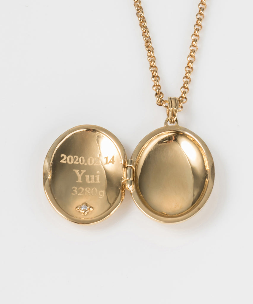 毎日身につけるお守りをイメージしてデザインしたロケットネックレス。表面にはお好きなイニシャル、内側には日付や名前、産まれたお子様の体重などお好きな刻印と誕生石を入れて自分だけのオリジナルロケットをオーダーいただけます。