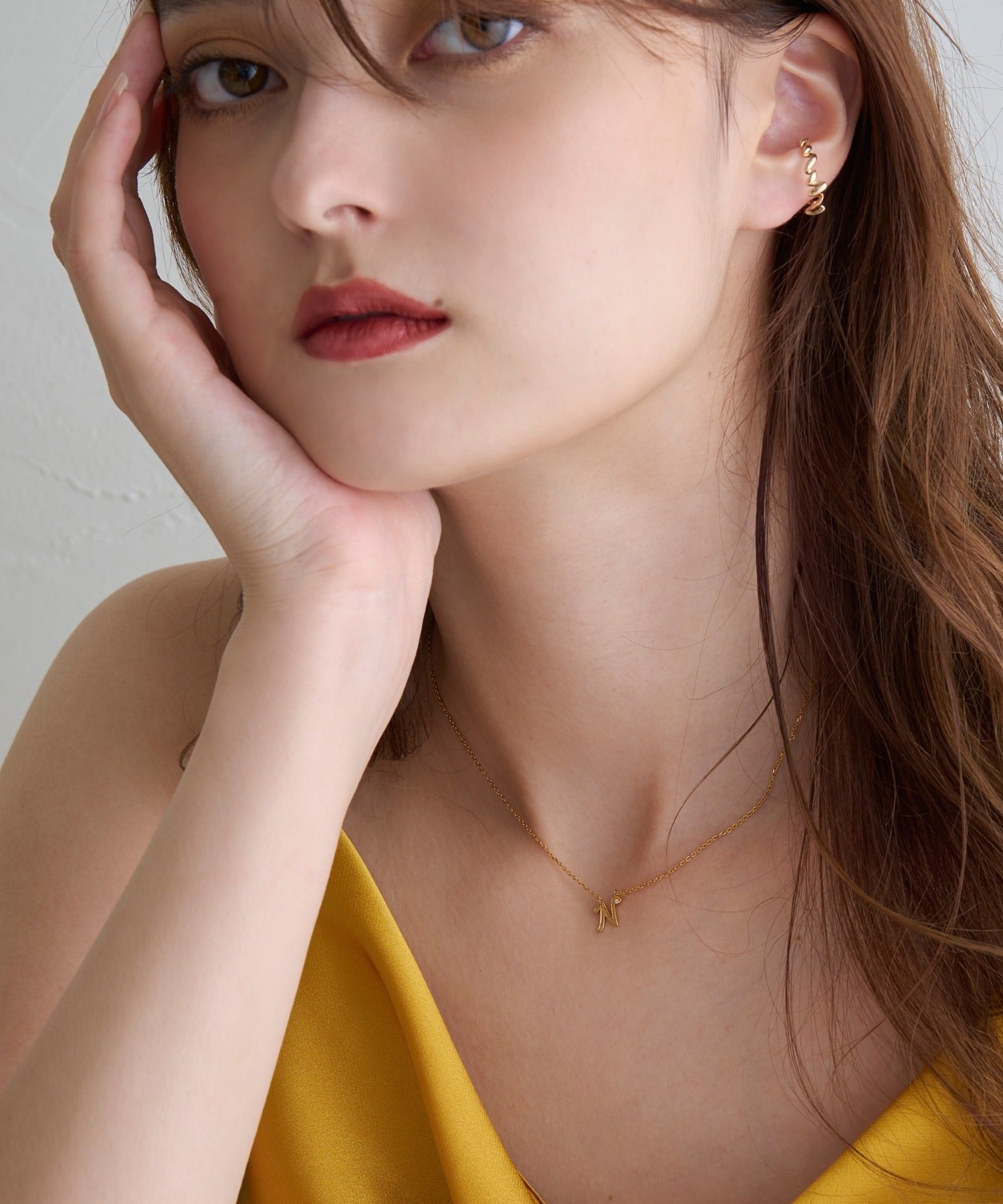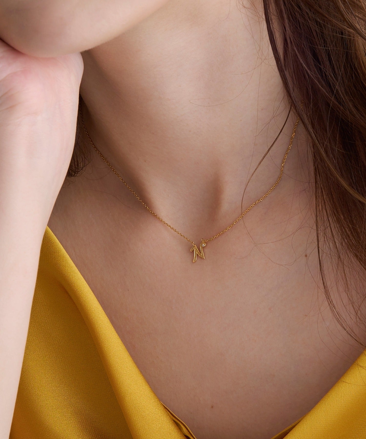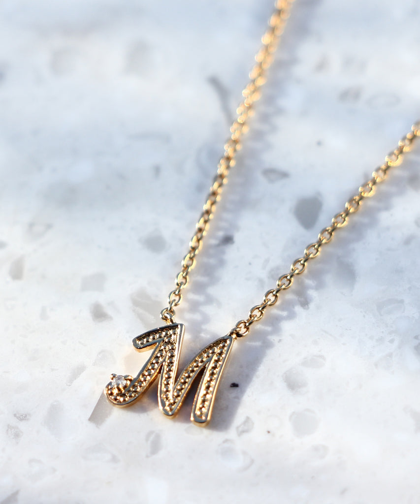 ミル打ちのテクスチャーに、ダイヤが1石輝く高級感のあるデザイン。程よく主張するイニシャルモチーフのサイズ感が魅力的。お守りのように身に着けたいジュエリーです。