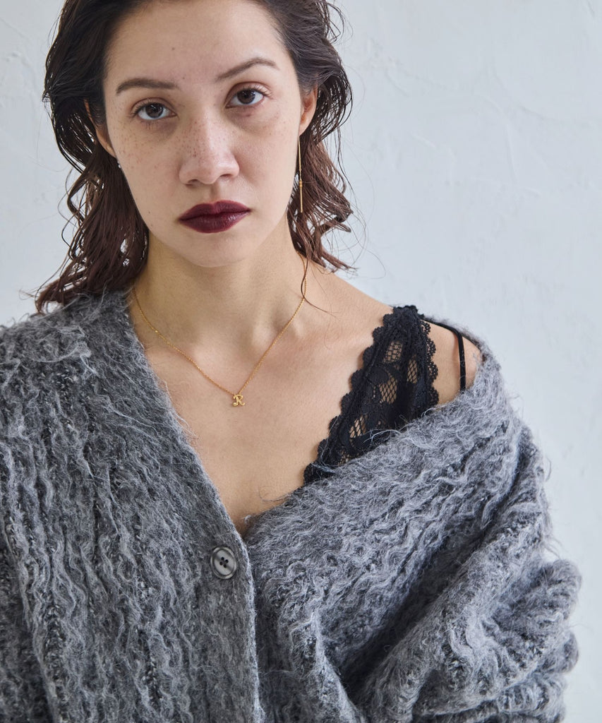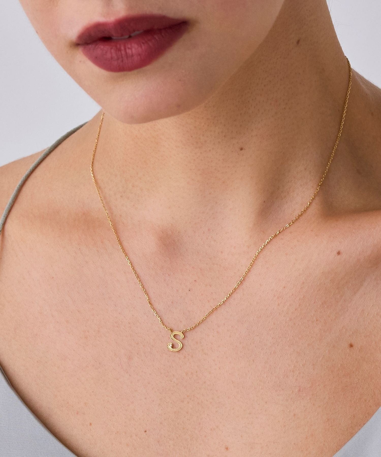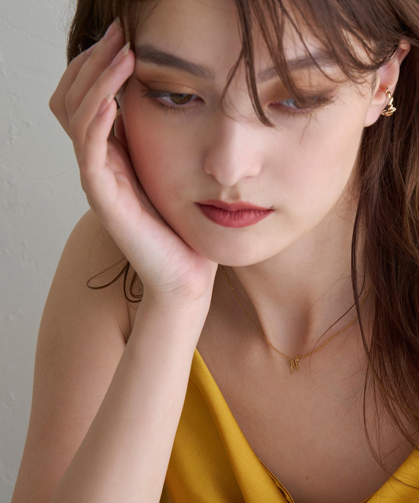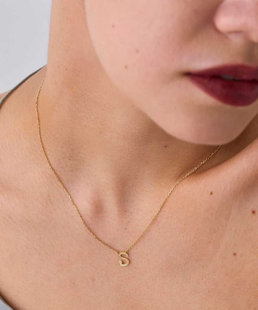 ミル打ちのテクスチャーに、ダイヤが1石輝く高級感のあるデザイン。程よく主張するイニシャルモチーフのサイズ感が魅力的。お守りのように身に着けたいジュエリーです。
