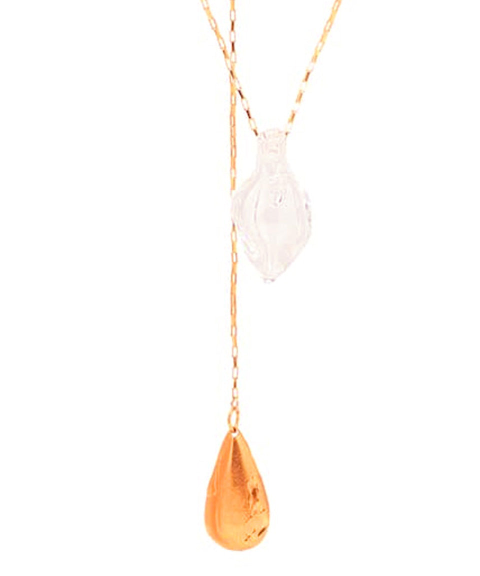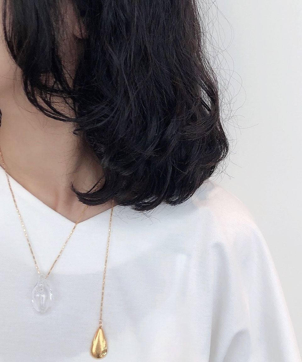 大ぶりな手吹きガラスが特徴的なネックレスです。2本のネックレスを重ね付けしたようなデザインが目を惹き、こなれたレイヤードスタイルが完成します。