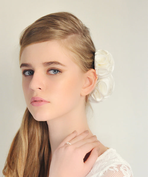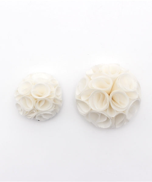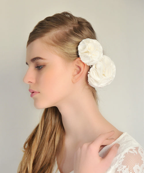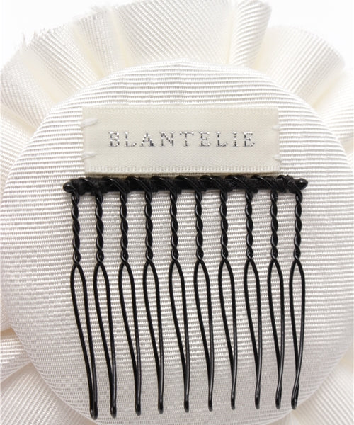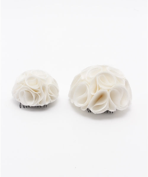 透け感のある生地を重ね合わせた花が密集したブーケのようで、ヘアアレンジにボリュームを与えます。和装にもお使い頂ける、ゴージャスさとシンプルさを兼ね備えたヘアアクセサリーです。