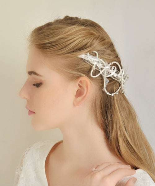 ボブスタイルや、シンプルなヘアアレンジに合わせても、リボンを取り外して後頭部に合わせてもバランスを取りやすい透け感とボリュームです。