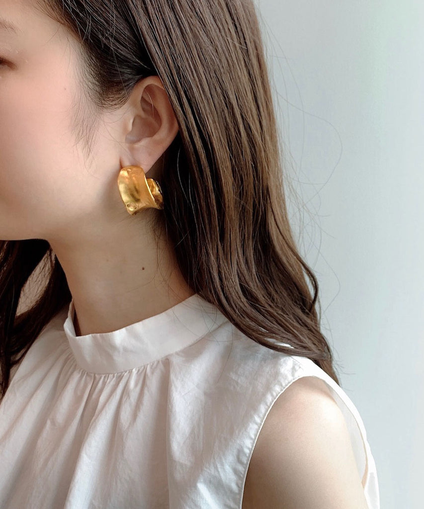 ひとくせあるフォルムのフープピアス。ベーシックなアイテムだからこそ、少しエッジの効いたデザインを取り入れることでコーディネートをアップグレードしてくれます。