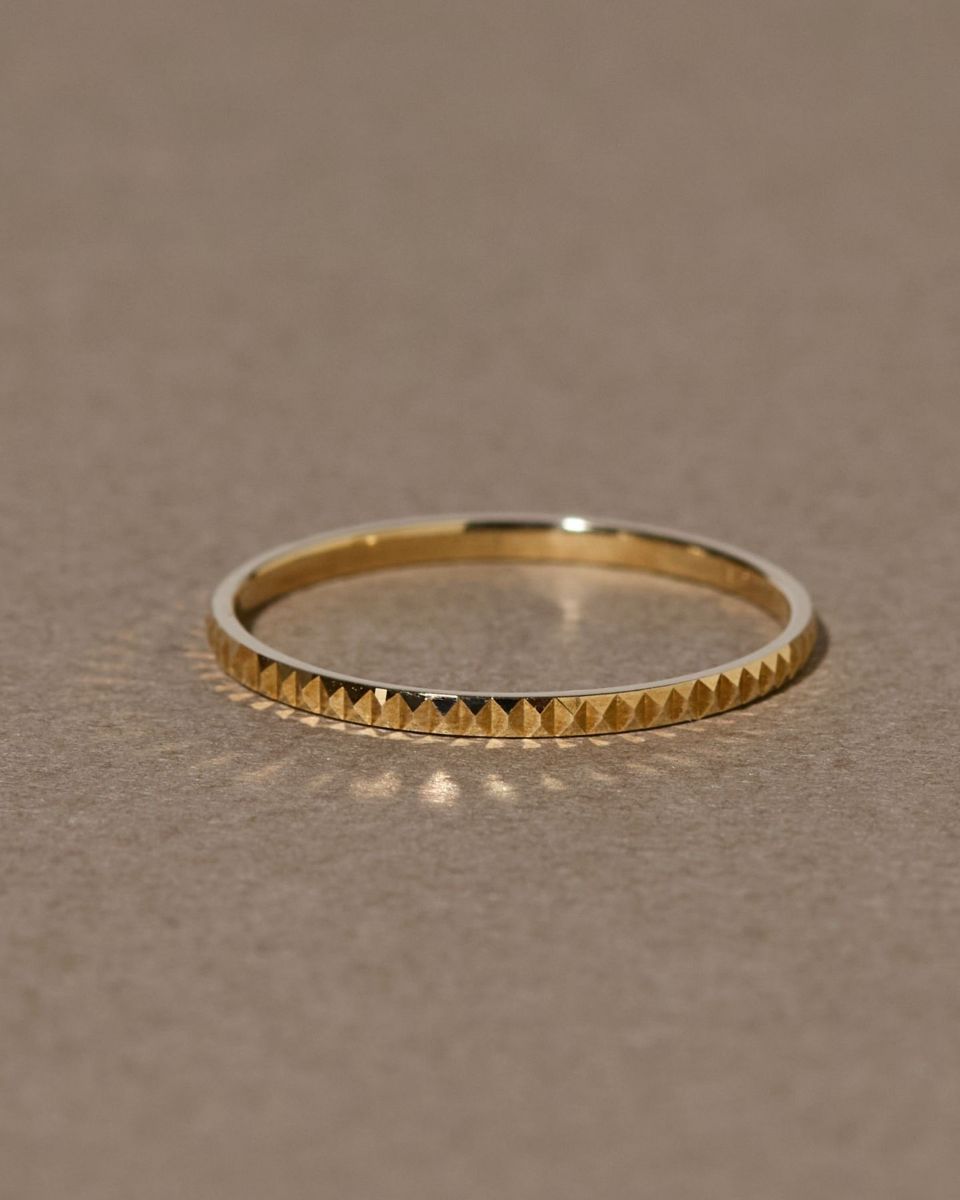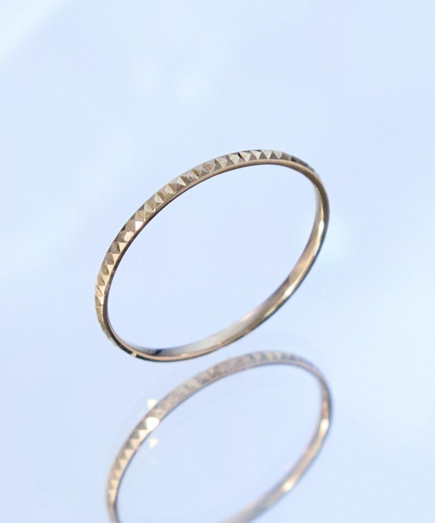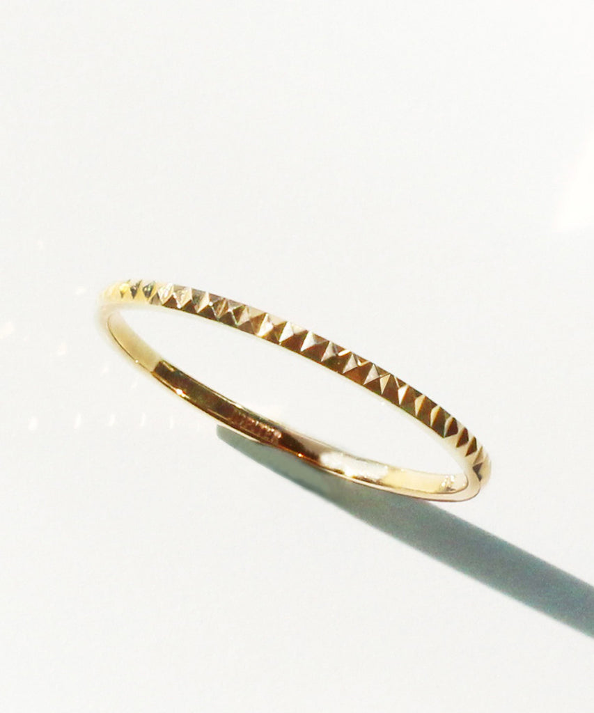 ピラミッド型のスタッズが細かく施されたリング。何本も重ねて付けて、表情の違った輝きのコーディネートを楽しめます。1周に渡ってカットが施されており、どの角度からもキラキラと輝きます。