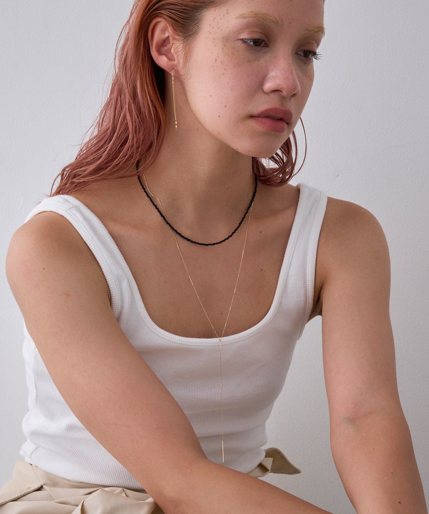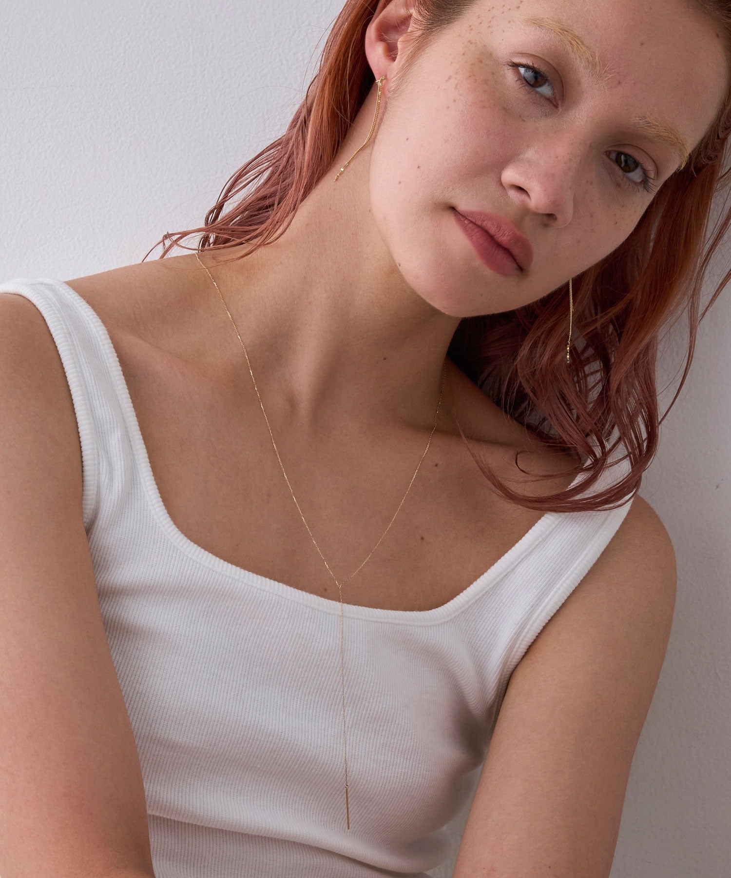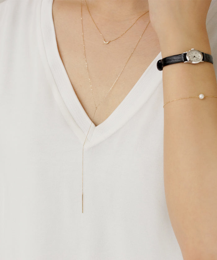 首もとをすっきりと綺麗に見せてくれる人気のロングタイプ。ゴールドのバーが揺れて輝き、モダンな表情を演出します。