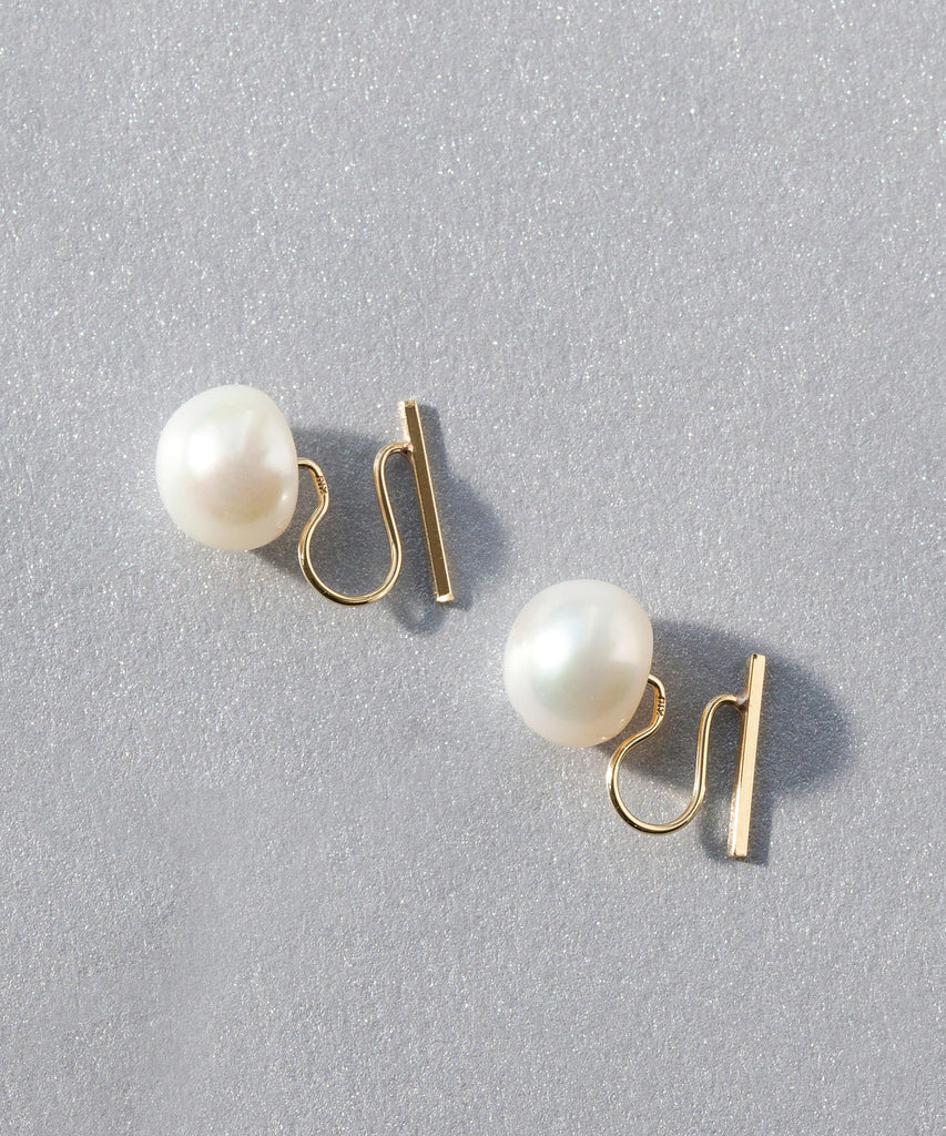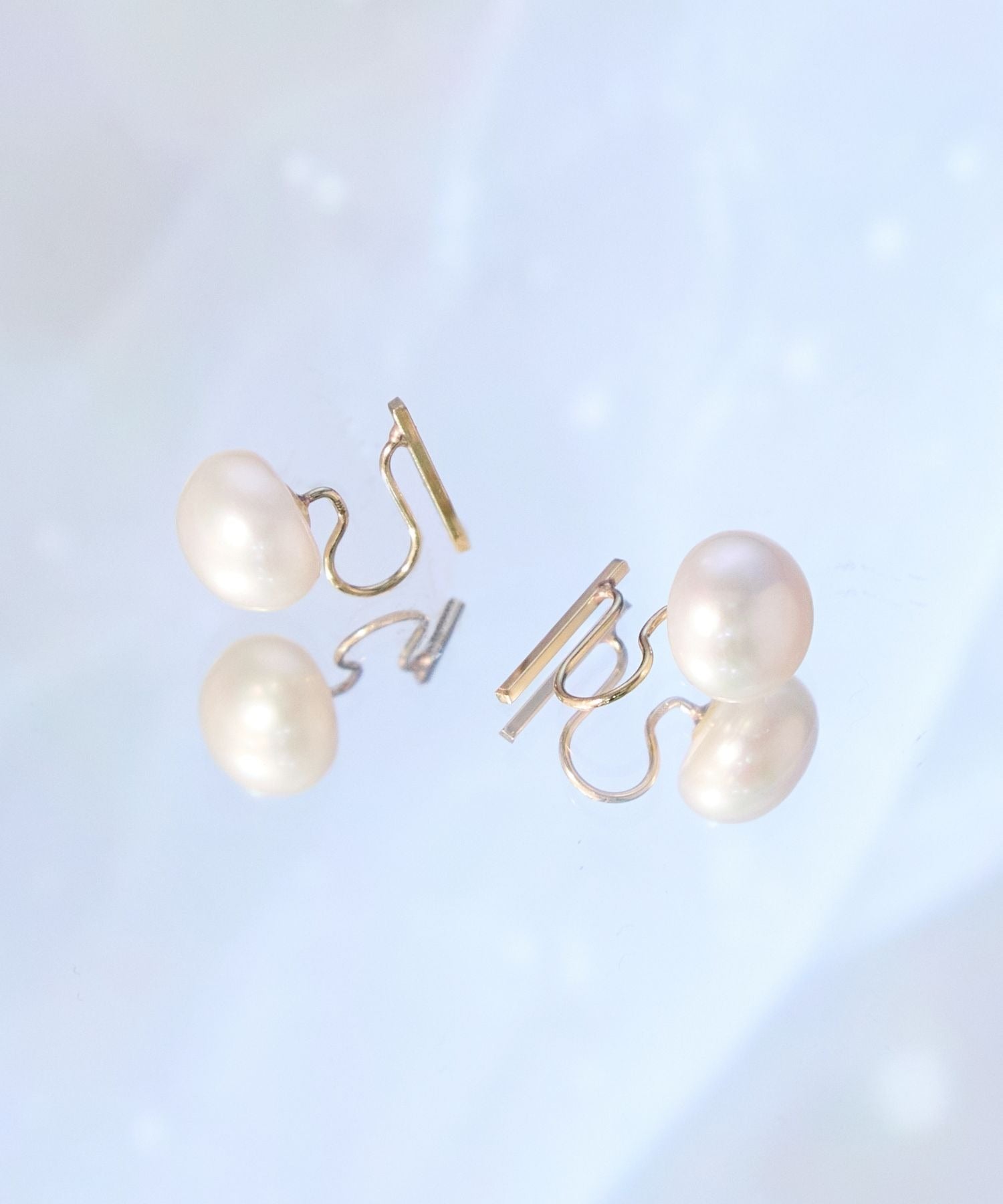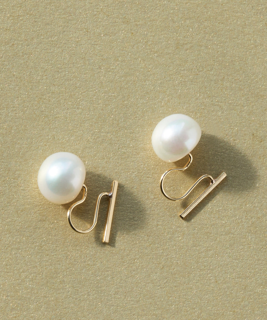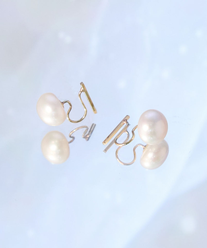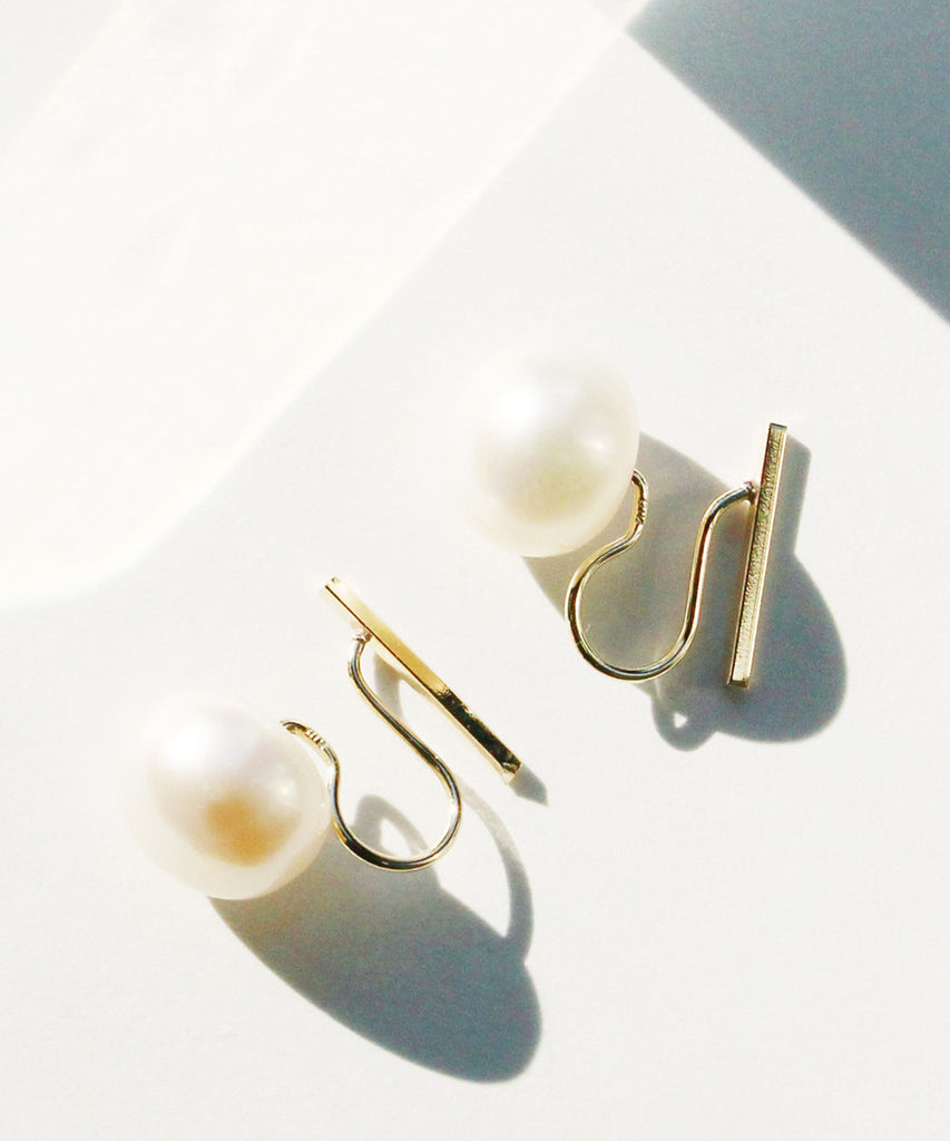 痛くなりにくいクリップ式イヤリングで耳たぶに挟むだけの簡単な着け方で、金具を目立たせずにイヤリングを楽しめます。大粒パールとバーモチーフでクリップ金具が隠れて、ピアスを着けているように見えます。