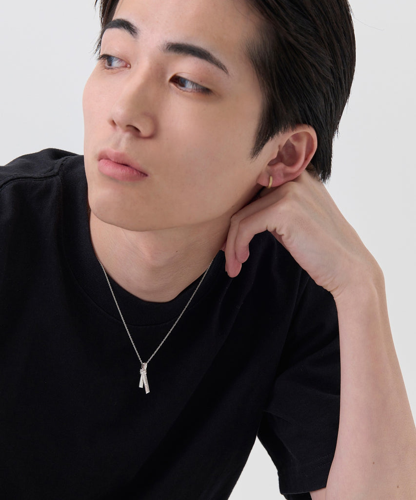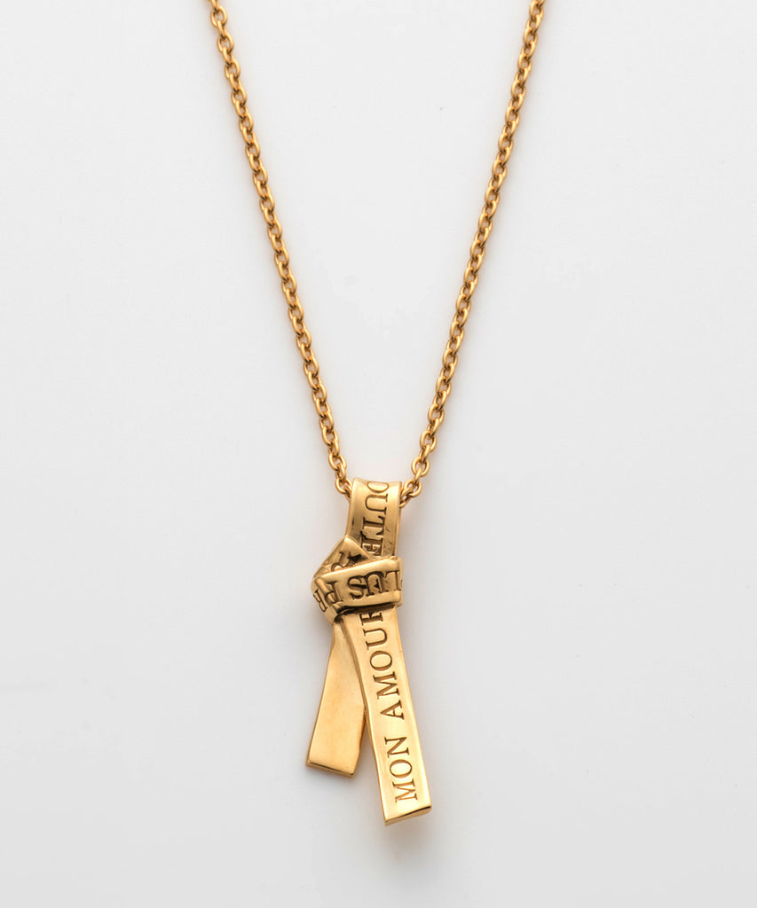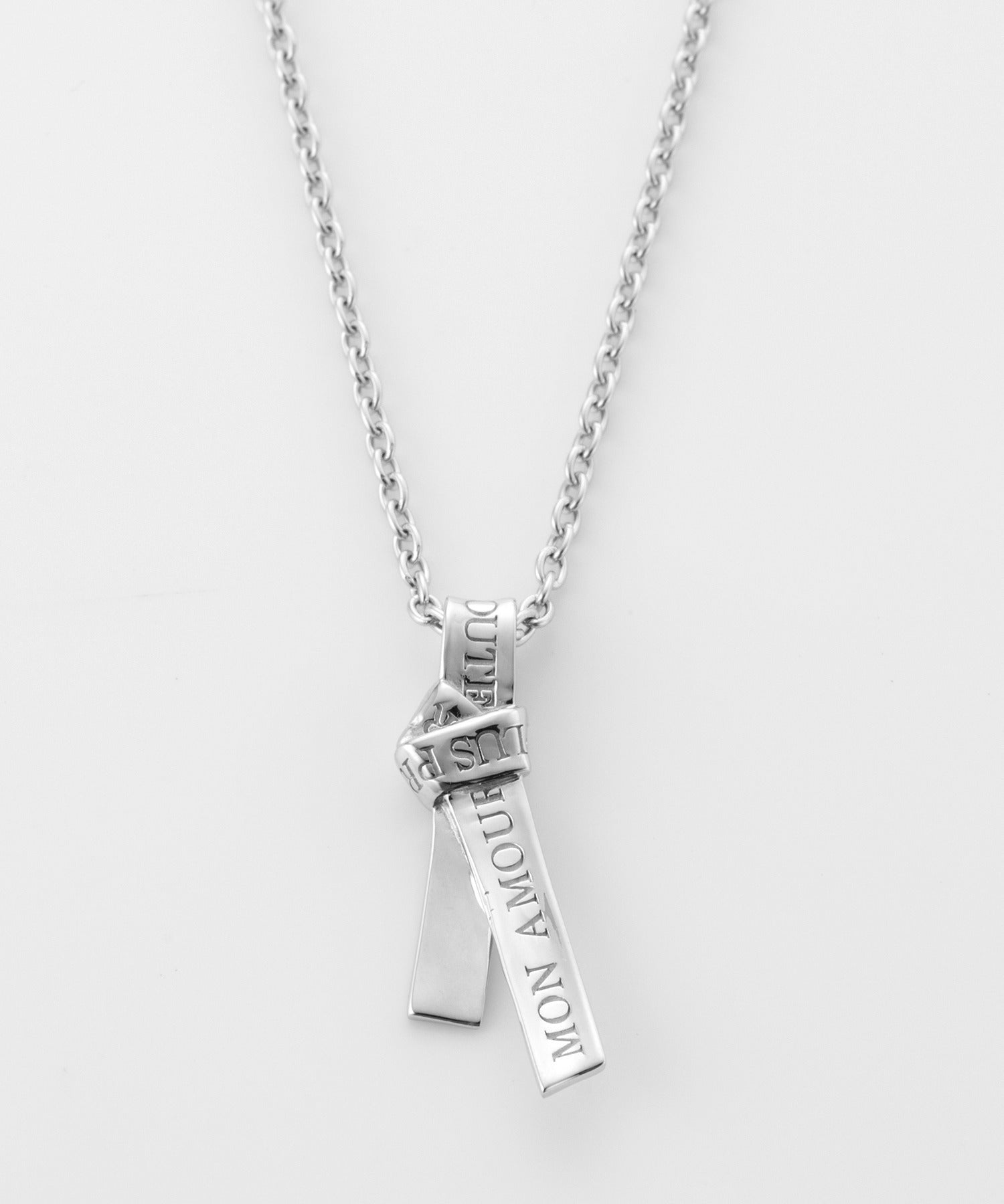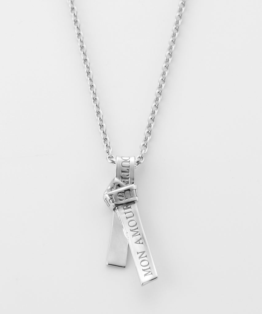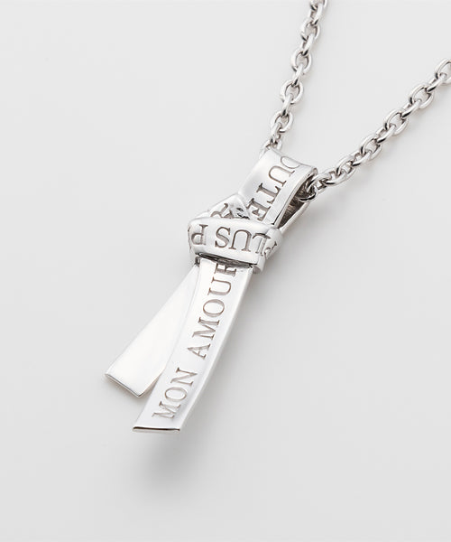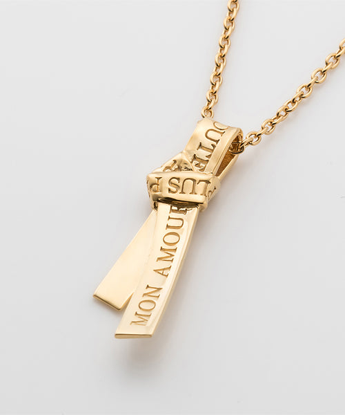 愛の言葉を刻み込んだ1本のリボンを、ネクタイのように結んで離れることのない愛を表現したネックレス。