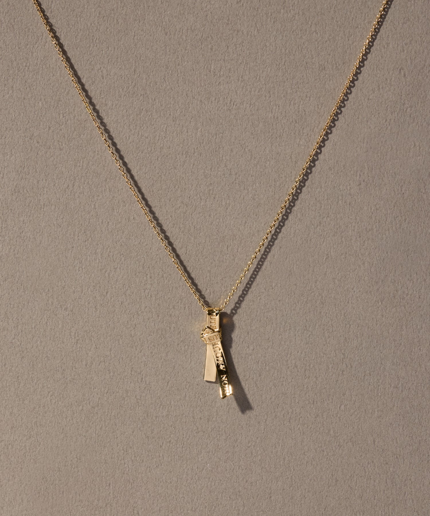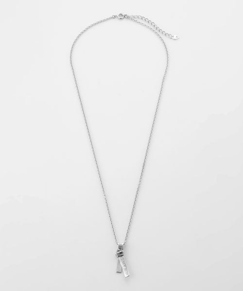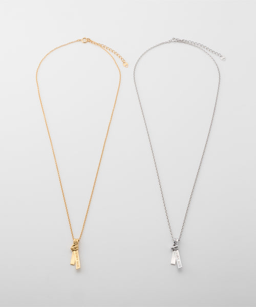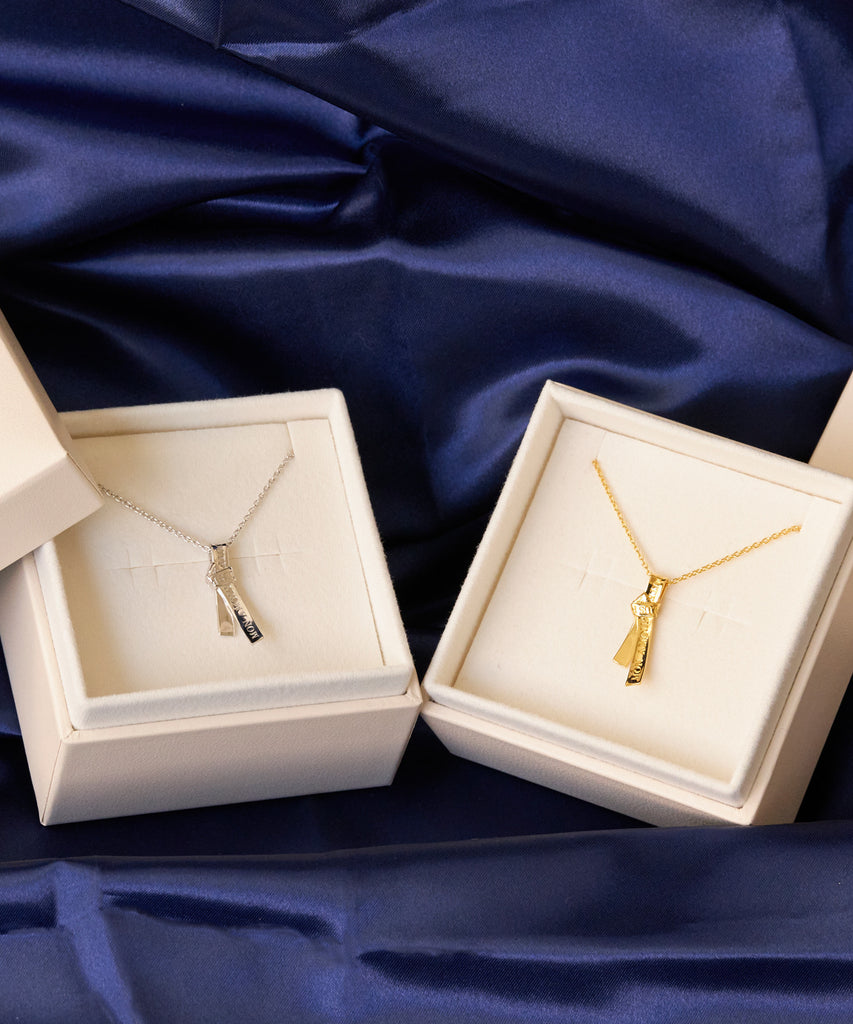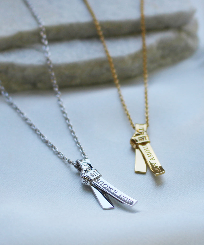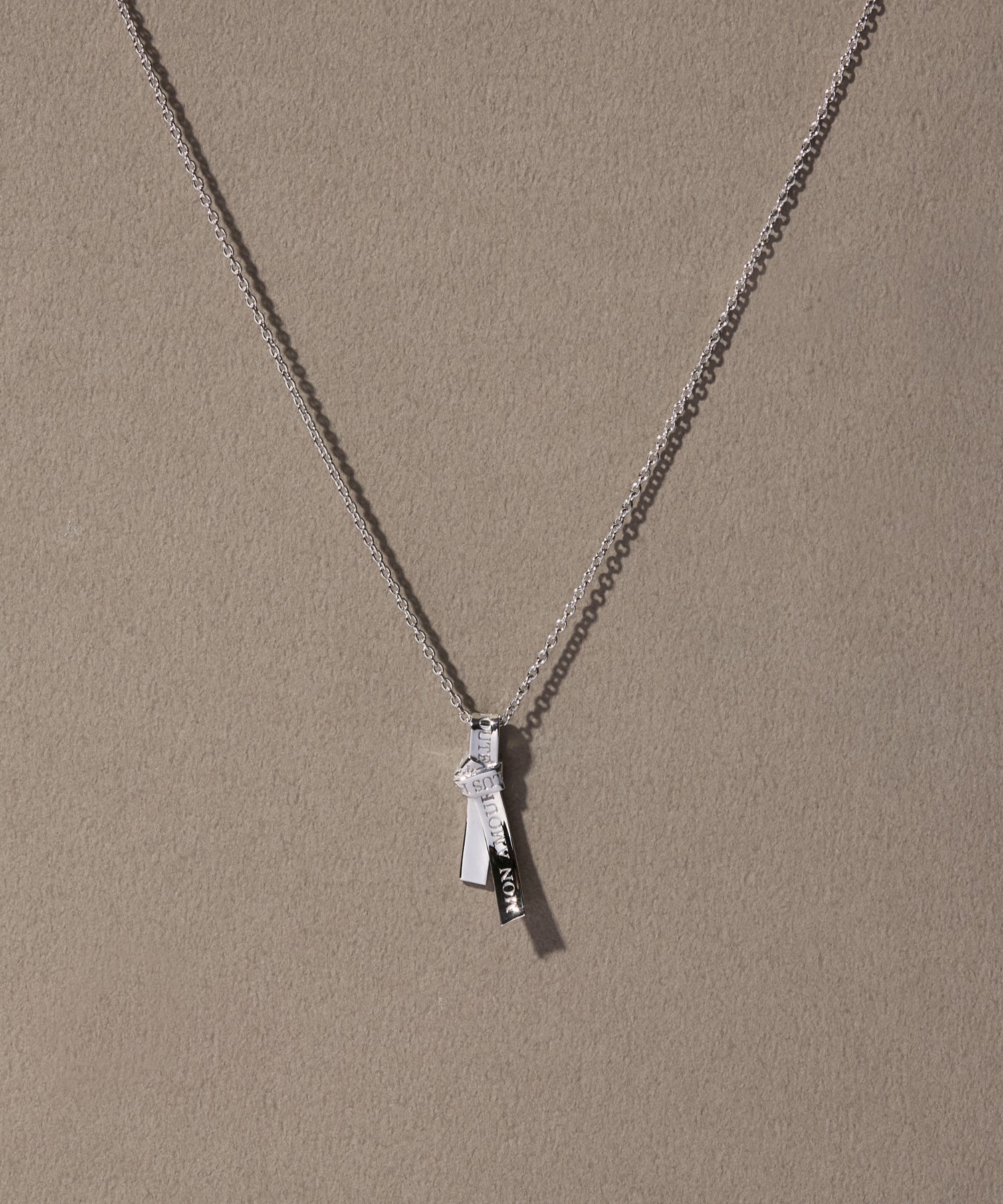 愛の言葉を刻み込んだ1本のリボンを、ネクタイのように結んで離れることのない愛を表現したネックレス。