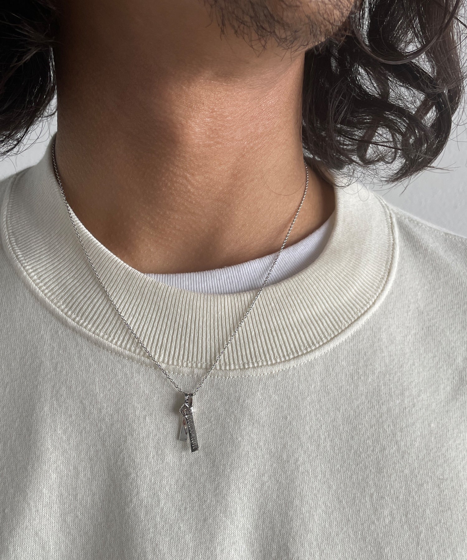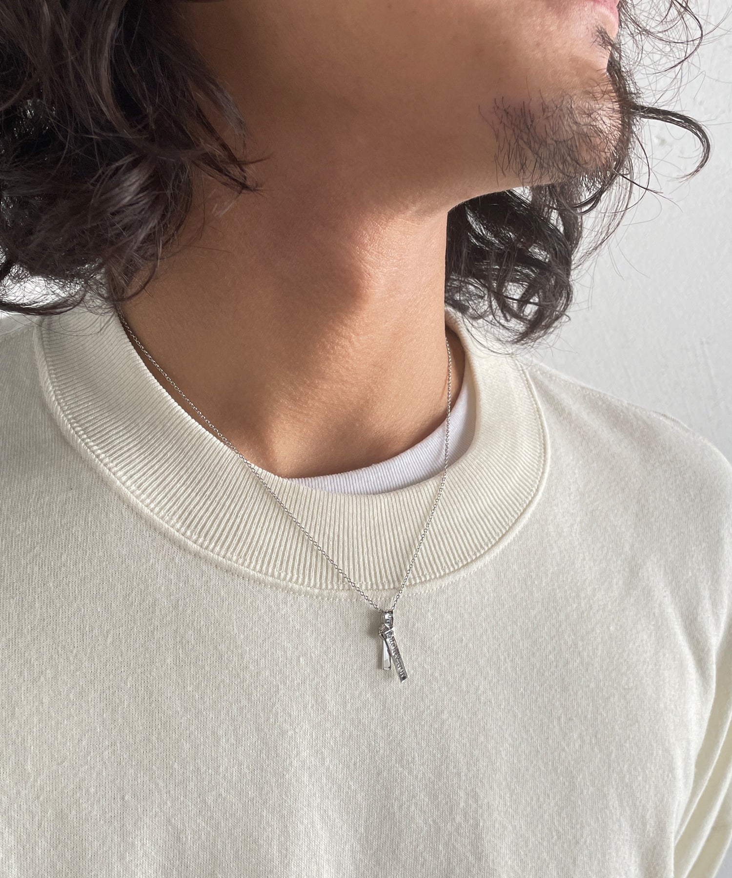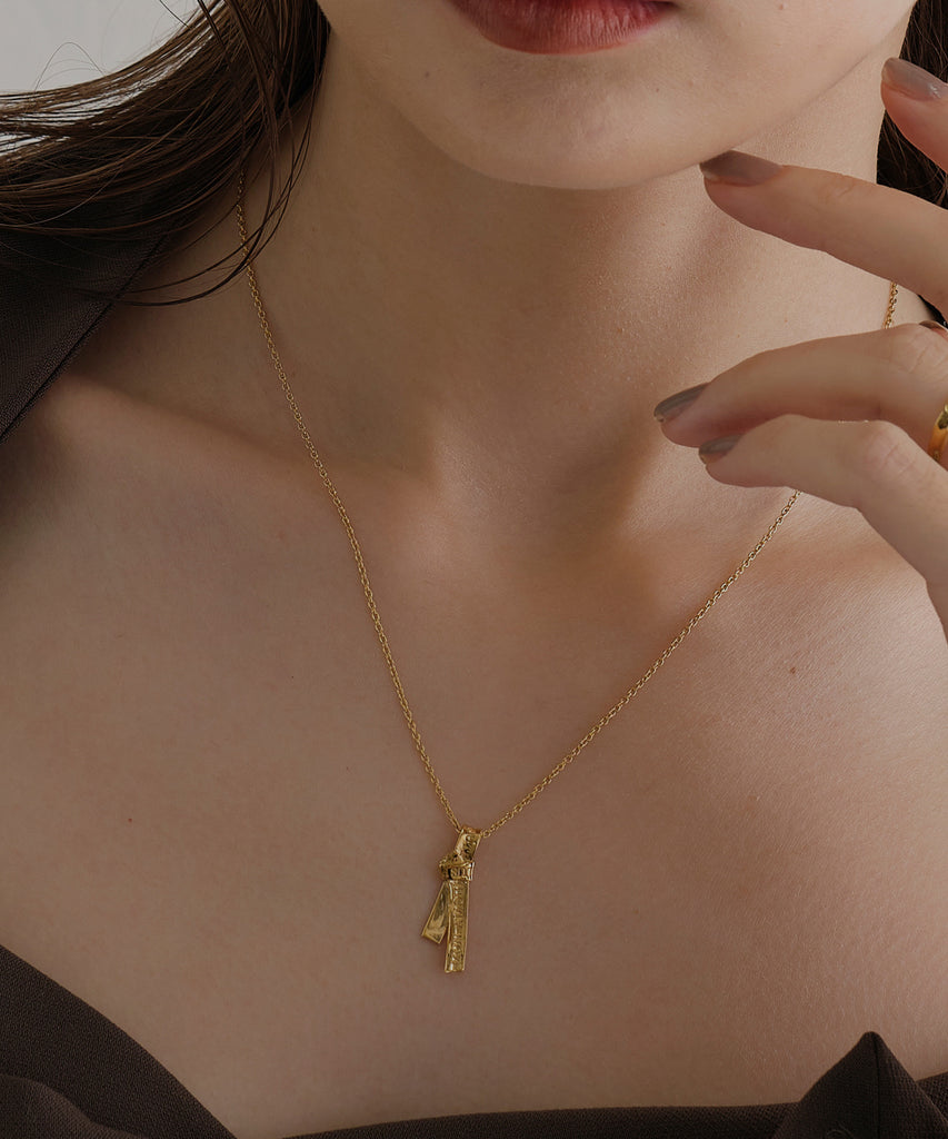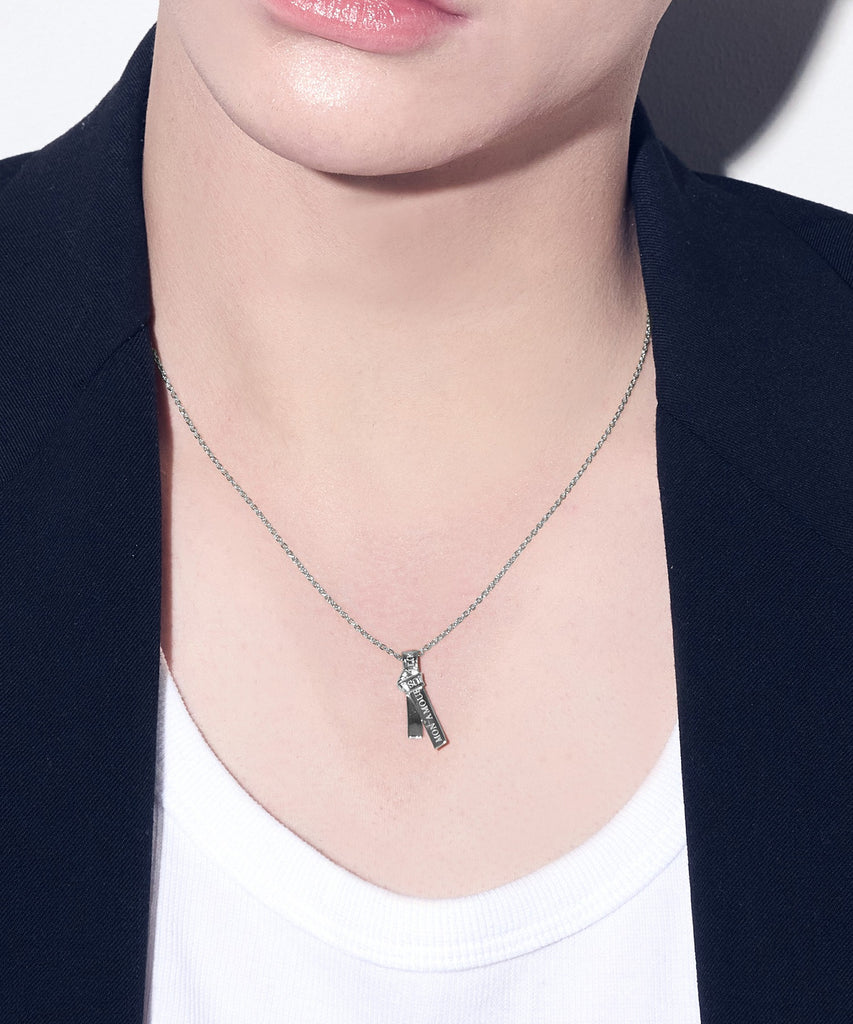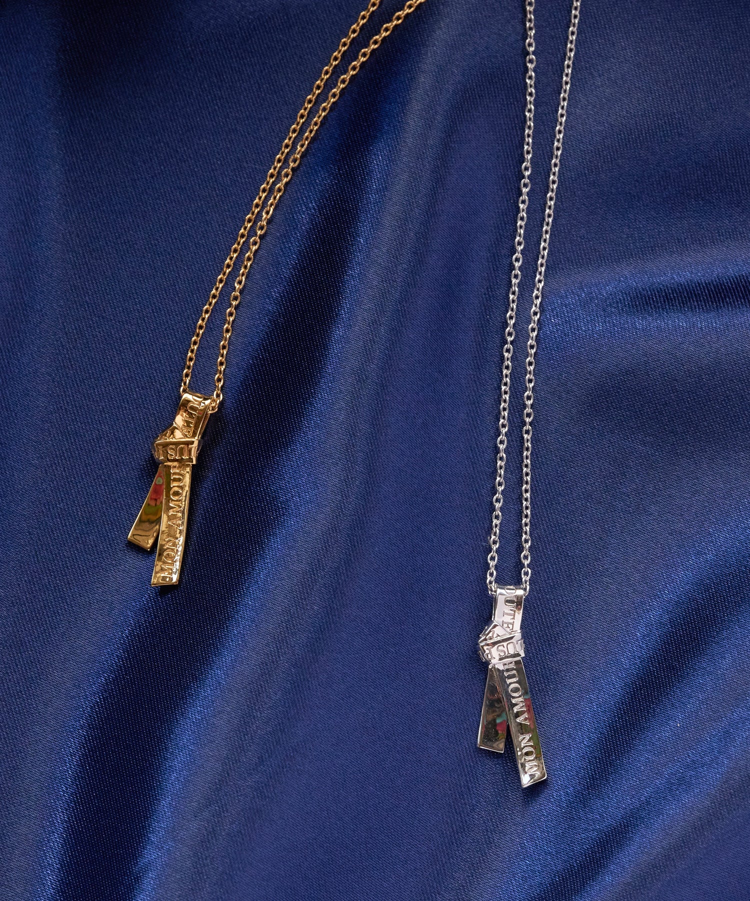 愛の言葉を刻み込んだ1本のリボンを、ネクタイのように結んで離れることのない愛を表現したネックレス。